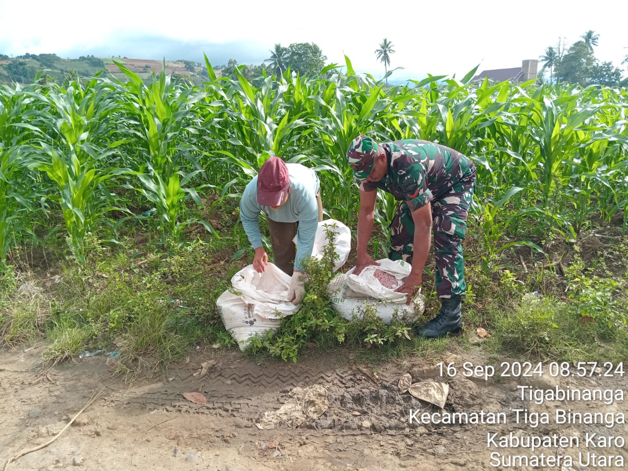 Tanah Karo. Senin 16/09/2024. Di wilayah binaannya Kopda Ediyansah Tarigan sebagai Babinsa di Koramil 08/Tigabinanga jajaran Kodim 0205/Tanah Karo sesuai perintah dari Danramil Kapten Inf JMH tampubolon agar melaksanakan kegiatan Komunikasi Sosial silaturahmi sambil pendampingan pertanian yaitu membantu merawat tanaman jagung di ladang (lahan pertanian) seluas 0,6 hektar milik warga desa binaan di Desa Tigabinanga Kecamatan Tigabinanga Kabupaten Karo-Sumatera Utara