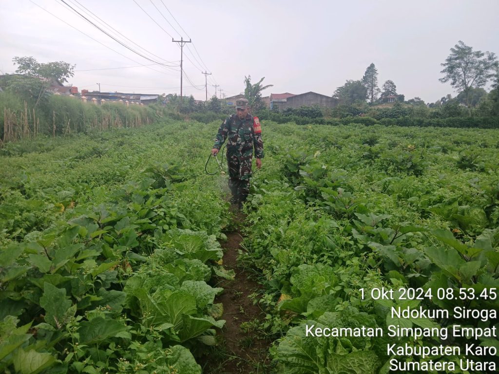 Simpang Empat. Selasa 01/10/2024. Serma Martua Sihombing yang bertugas sebagai Babisa di Koramil 04/Simpang Empat jajaran Kodim 0205/Tanah Karo melaksanakan kegiatan Komsos (Komunikasi Sosial) bersilaturahmi dan Pendampingan Pertanian yaitu secara langsung mendampingi warga wilayah binaan yaitu Bapak Rudi Tarigan yang sedang merawat tanaman sayur Sawi Putih dasn Terong Antaboga dilahan pertanian seluas 0,9 hektar yang berlokasi di Desa Gajah Kecamatan Simpang Empat Kabupaten Karo-Sumatera Utara (01/10)