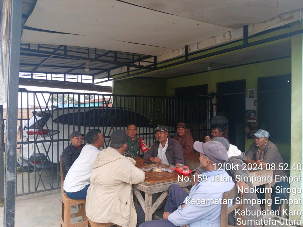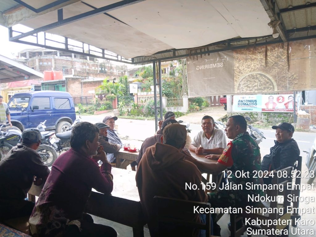 Tanah Karo. Sabtu 12/10/2024. Babinsa Koramil 04/Simpang Empat Kodim 0205/Tanah Karo Serma Martua Sihombing yang akrab dipanggil warga “Bang Hombing” dalam rangka Komsos (Komunikasi Sosial) dirinya melaksanakan kegiatan bersilaturahmi dengan masyarakat warga wilayah binaannya bertempat di Kedai Kopi Joni Sembiring yang berada di Simpang Empat Jalan Kiras Bangun dan Jalan Udara Desa Ndokum Siroga Kecamatan Simnpang Enpat Kabupate Karo-Sumatera Utara (12/10).
