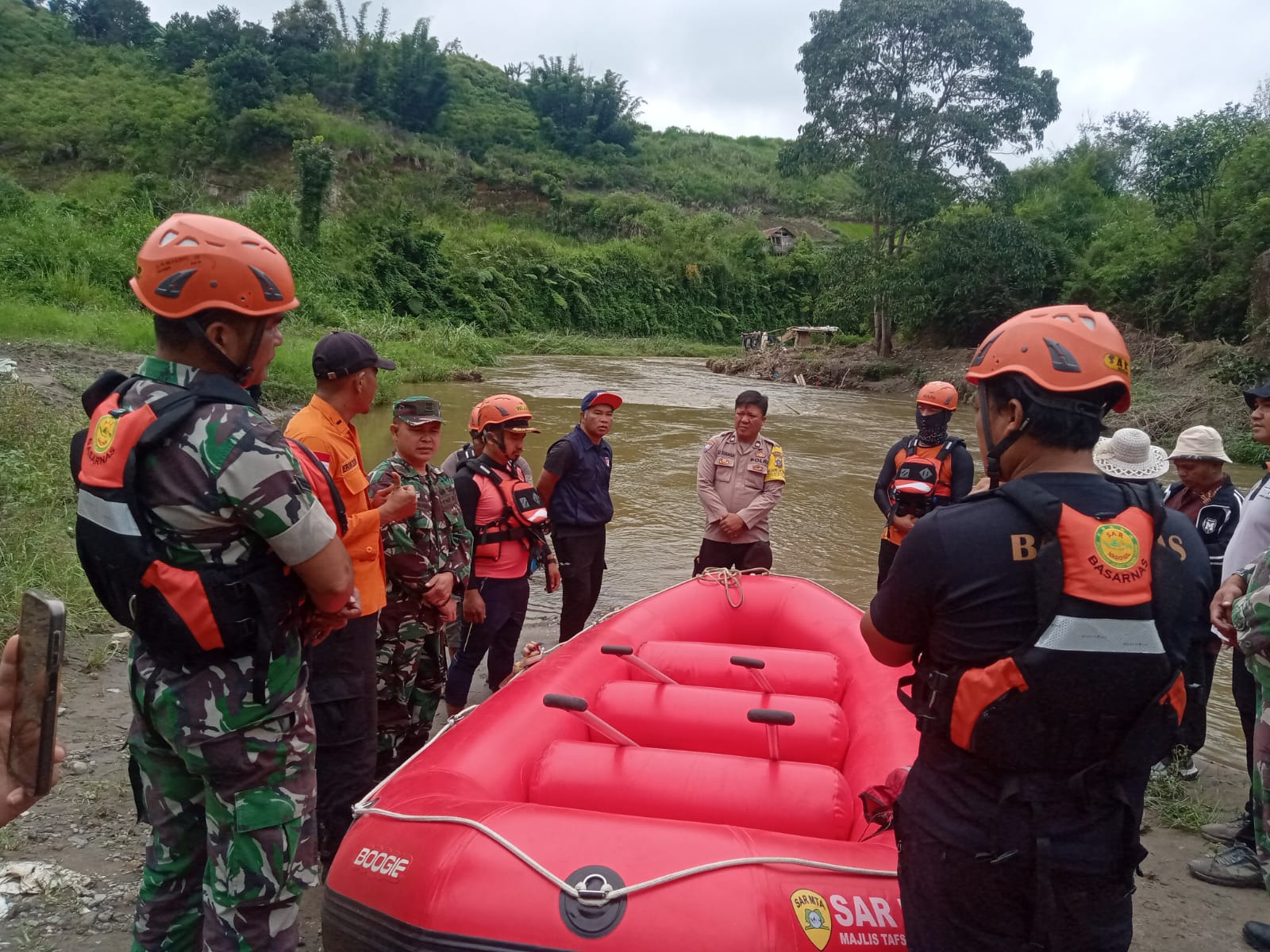 Tanah Karo. Minggu 13/10/2024. Danramil 02/Tigapanah Kodim 0205/TK Kapten Inf Judika Naibaho beserta anggota bersama Personil Polsek Tigapanah jajaran Polres Tanah Karo, Personel BPBD Kab. Karo, Tim Basarnas Sumut, Pihak Keluarga Korban dan Masyarakat Desa Bunuraya, melaksanakan kegiatan Hari Ke-3 Pencarian orang hanyut di Penggaliam Pasir Laudah Sungai Laubiang Desa Bunuraya Kec. Tigapanah Kab. Karo-Sumut.