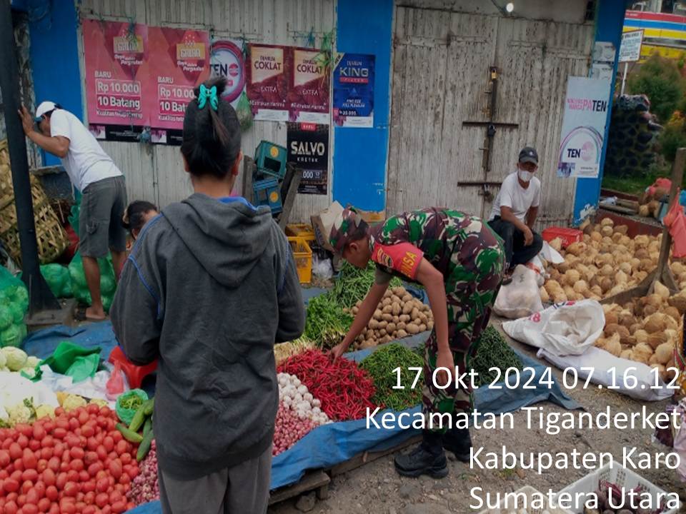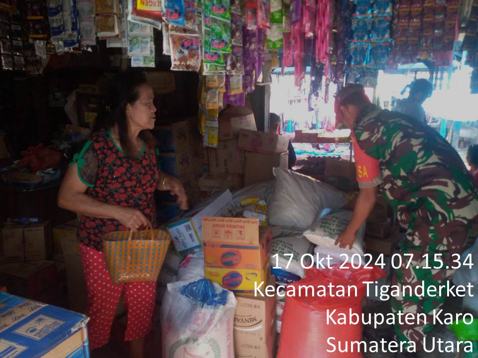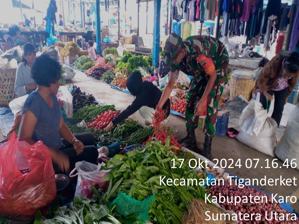 Sertu Eka Suranta Sembiring juga bertugas sebagai Babinsa di Koramil 05/Payung diperintah Danramil agar pada hari ini (17/10) juga melaksanakan kegiatan tersebut sebagai melaksanakan Komsos di wilayah binaan sambil monitoring cek secara langsung harga dan ketersediaan bahan pangan terutama Sembako yaitu beras, minyak goreng/mentega, telur, gula pasir, garam, bawang, susu, ikan, daging, dan bahan bakar LPG 3 Kg termasuk sayur mayur dan buah-buahan maupun  rempah-rempah di Pasar Tiganderket Jl. Kuta Buluh Desa Tiganderket  Kecamatan Tiganderket Kabupaten Karo-SUMUT, kegiatan ini juag dalam rangka pengecekan Sembako untuk pemenuhan kebutuhan warga sehari-hari.