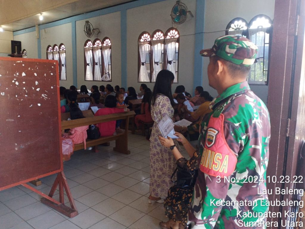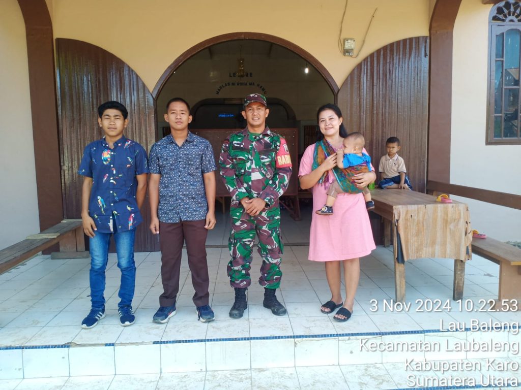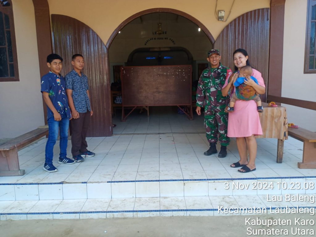 Tanah Karo. Minggu 03/11/2024. Para Bintara Pembina Desa (Babisan) di Koramil 09/Laubaleng jajaran Kodim 0205/Tanah Karo dalam rangka Komunikasi sosial (Komsos) setiap hari minggu melaksanakan bersilaturahmi dan membantu majelis gereja dalam pengamanan Ibadah Kebaktian Minggu di wilayah binaannya masing-masing juga sambil melaksanakan imbuan kepada warga tentang menjaga keamanan dan ketertiban lingkungan, menjaga kebersihan dan kelestarian lingkungan serta tetap menjaga kerukunan hidup antar warga.