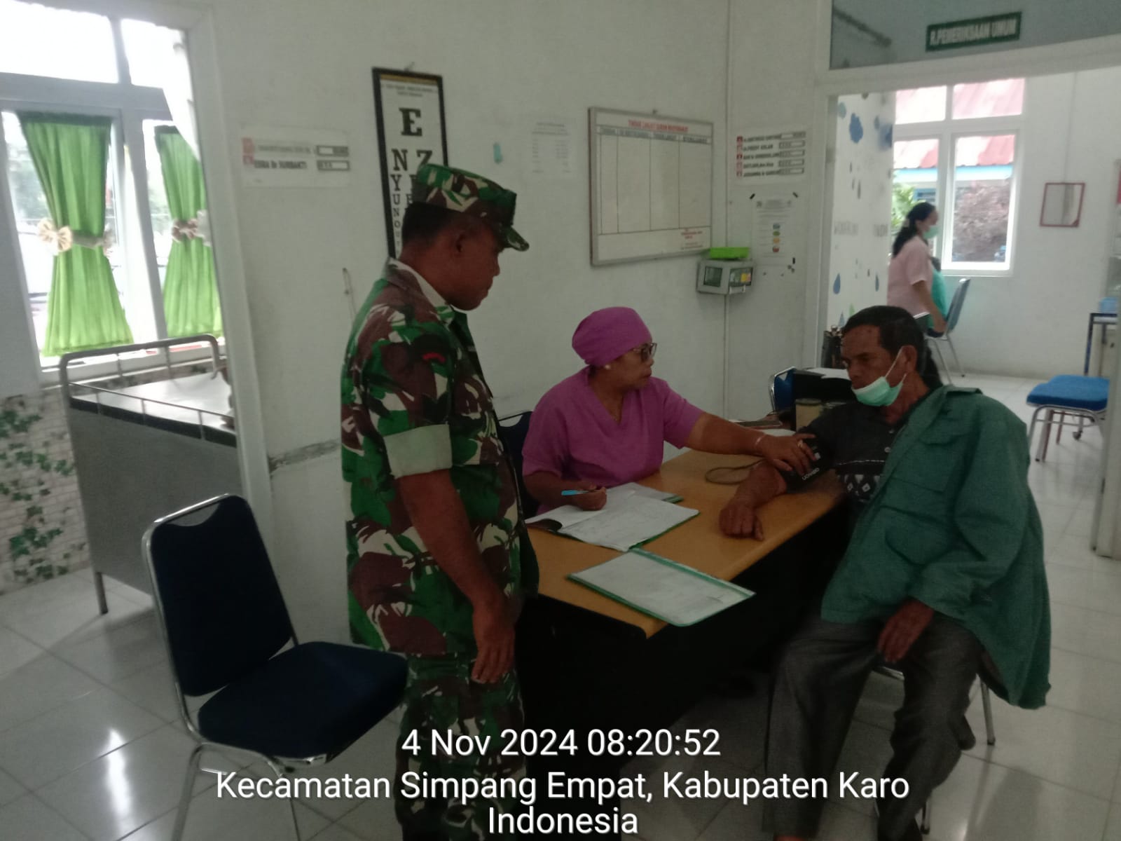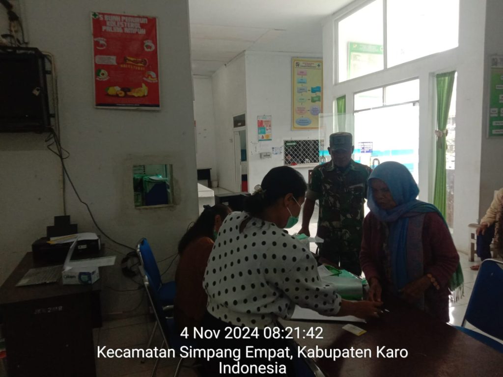 Serka Sudino Sihombing juga bertugas sebagai Babinsa di Koramil 04/Simpang Empat hari ini (04/11) juga melaksanakan kegiatan tersebut dengan penuh rasa tanggung jawab dan kepedulian terhadap kesehatan masyarakat desa binaannya, juga sebagai bentuk Kemanunggalan TNI dengan Rakyat, membantu warga desa binaan berobat masyarakat warga Desa Perteguhen Kecamantan Simpang Empat Kabupaten Karo-Sumatera Utara untuk berobat dan mengecek kesehatan ke Puskesmas Simpang Empat Jl. Kiras Bangun Desa Ndokujm Siroga, selain itu kegiatanpun sambil bersilaturahmi dengan Tenaga Kesehatan dan mengecek ketersediaan obat-obatan maupun kesiapan peralatan medis.