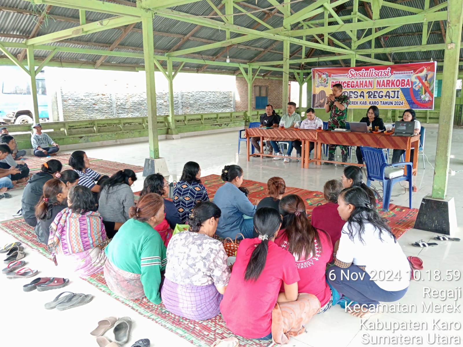 Tanah Karo. Rabu 06/11/2024. Batituud Koramil 02/Tigapanah jajaran Kodim 0205/Tanah Karo Pelda Yusmayanto mendapat perintah dari Danramil Kapten Inf Judika Naibaho untuk mewakili dirinya hadir dalam kegiatan Sosialisasi Pencegahan Narkoba yang diselenggaran oleh Pemerintah Desa Regaji anggran bersumber dari Anggaran Dana Desa Tahun 2024, kegiatan bertempat di Jambur / Balai Desa Jalan Kuta Desa Regaji Kecamatan Merek Kabupaten Karo-Sumatera Utara pada hari Kamis (06/11/2024).