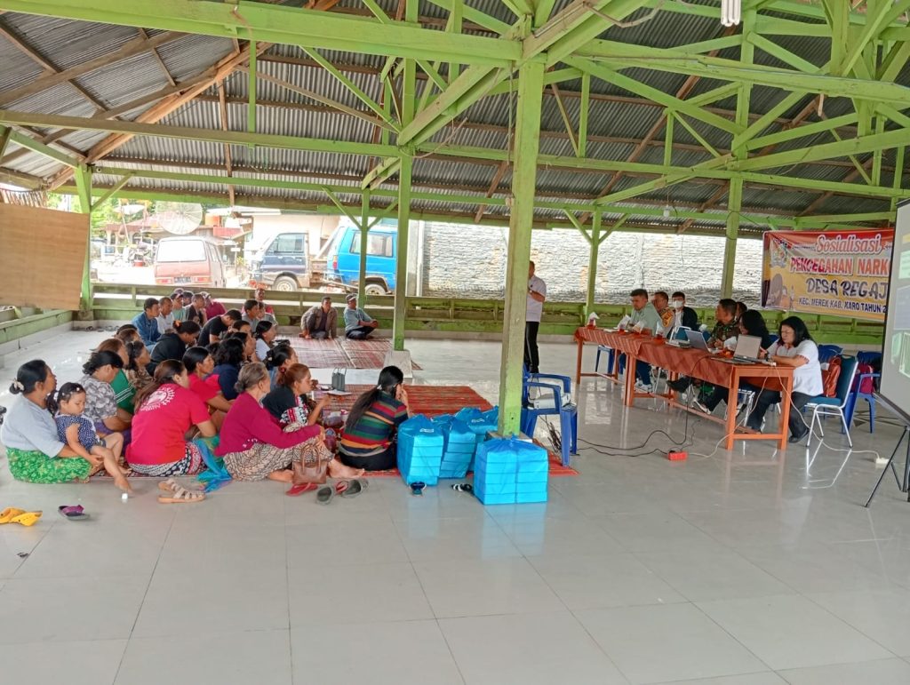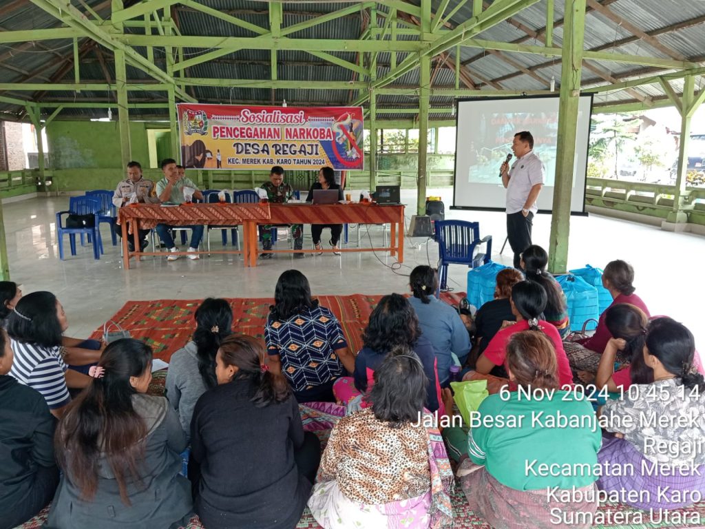 Sosialisasi Bahaya Narkoba kepada Masyarakat Desa Regaji ini dihadir oleh Barus Camat Merek Bapak Bartolomeus diwakili Kasi PMD Ibu Evi Beru Tarigan, Staf BNNK Karo dr. Suku Ginting (Narasumber ), Danramil diwakili Batuud Koramil 02/Tigapanah, Kapolsek Tigapanah diwakili Bhabinkamtibmas, Kepala Desa Regaji beserta Perangkat Desa, BPD Regaji, dan Masyarakat Desa Regaji.