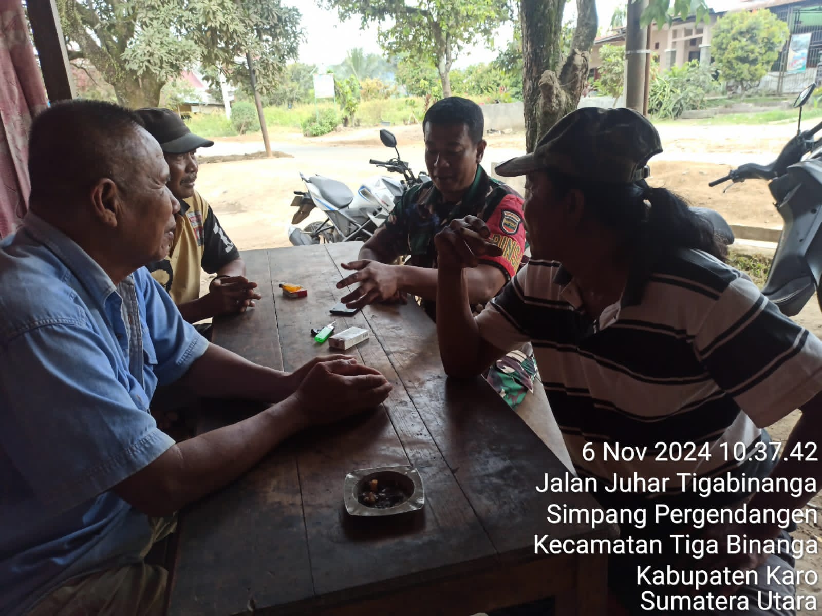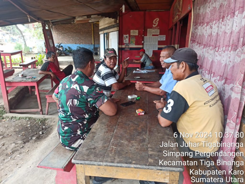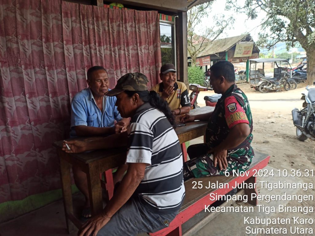 Tanah Karo. Rabu 06/11/2024.   Para Prajurit Satuan Teritorial TNI AD khusunya Babinsa menjaga jalinan tali silaturahmi dengan warga dalam rangka kegiatan Komunikasi Sosial (Kosmos) untuk mempererat hubungan TNI dan Rakyat juga untuk menghimpun informasi  perkembangan situasi Geo Demo Konsos di wilayah binaan, hal tersebut juga dilaksanakan  Kopda Erdiayansah Tarigan sebagai Babinsa (Bintara Pembina Desa) di Koramil 08/Tigapanah  jajaran Kodim 0205/Tanah Karo pada hari ini (06/11).