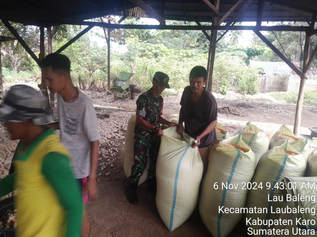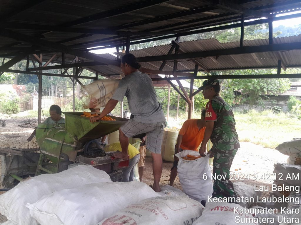 Tanah Karo. Rabu 06/11/2024. Bermacam upaya dan usaha untuk menyukseskan Program Ketahanan Pangan Nasional dilakukan oleh Pemerintah dari tingkat pusat hingga ke daerah juga mendukung menuju swasembada pangan nasional, sehingga Kapten Inf Gandhi N. Hartanto selaku Danramil 09/Laubaleng jajaran Kodim 0205/Tanah Karo perintahkan para Babinsanya melaksanakan kegiatan Upsus Ketapangnas yaitu membantu dan mendampingi warga menggolah hasil panen jagung.
