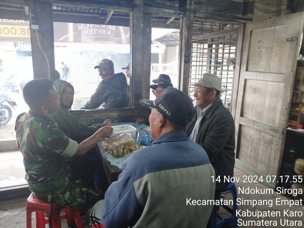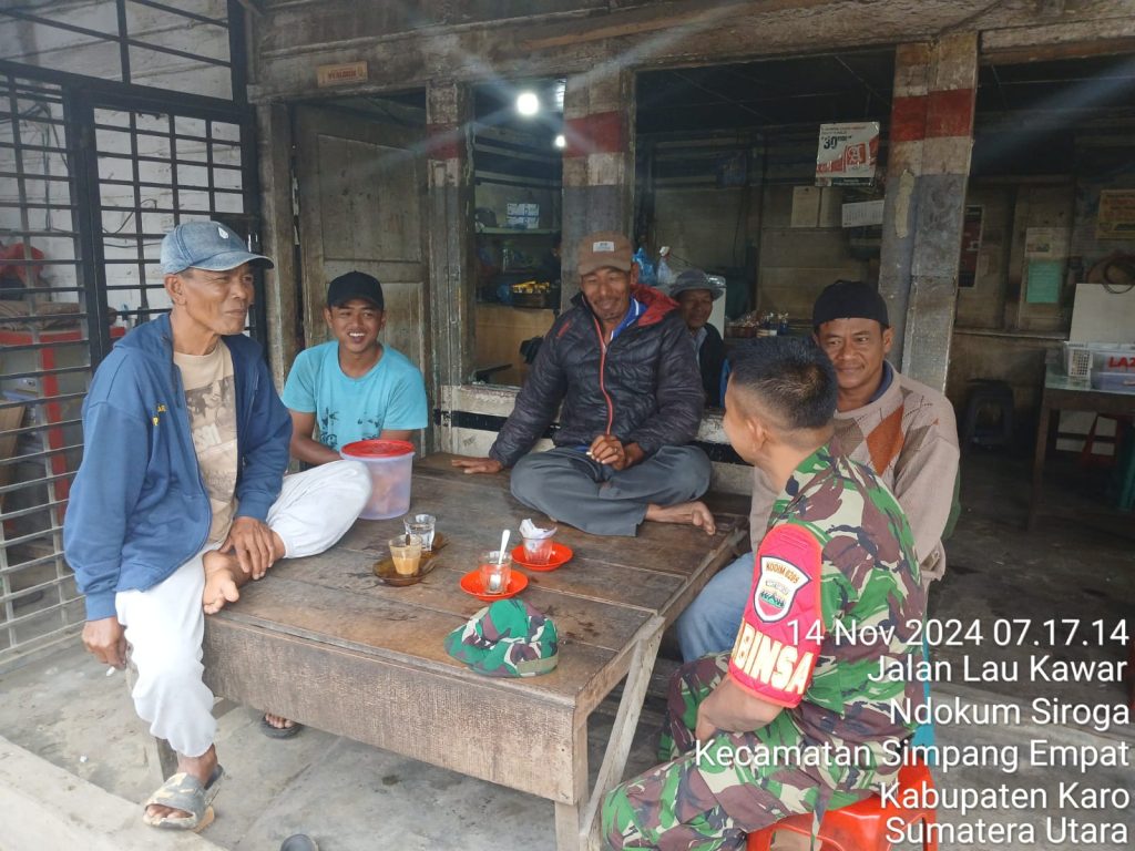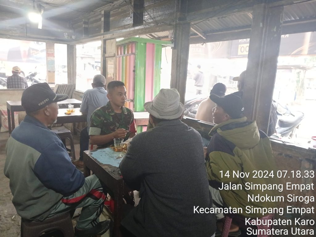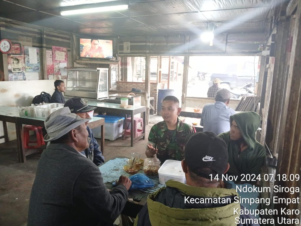 Sertu Jemmy Rombe Lambaran dalam bersilturahmi dengan warga dalam rangka kegiatan Komsos dan imbauan diutaman tentang menyukseskan Pilkada Serentak Tahun 2024 Kab. Karo yang dilaksanakan tidak hanya di Kedai Kopi Anton Ginting saja tapi sasarannya adalah warga yang sedang berada di Kedai Nasi, Bengkel Sepeda Motor, Toko Grosir Sembako, Kedai Kelontong, Kios Ponsel, Toko Pupuk, Mini Market dan Stasiun Angkutan Umum yang ada di Desa Ndokum Siroga.