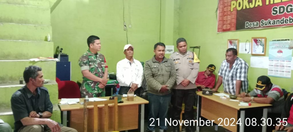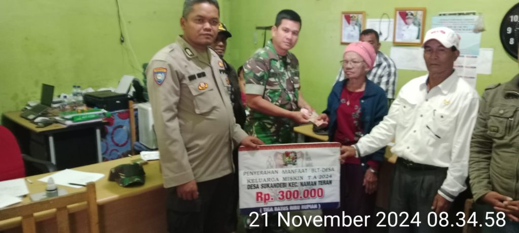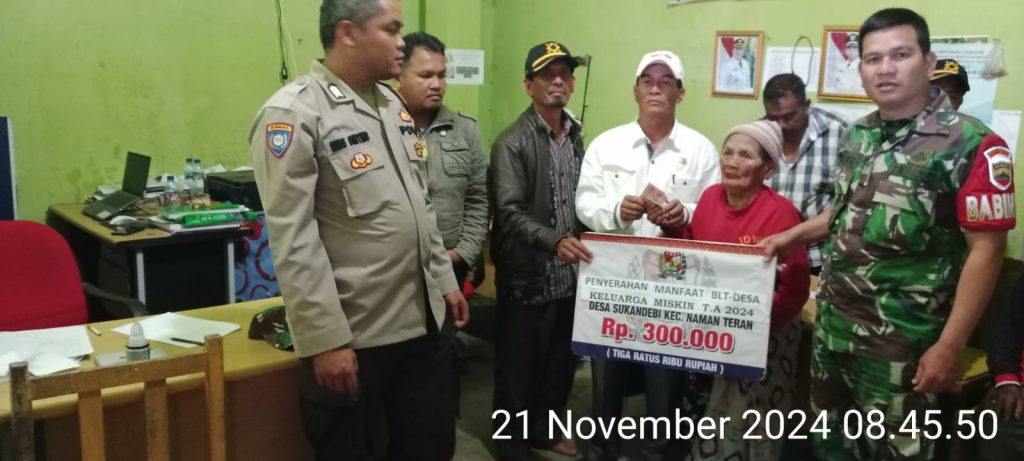 Tanah Karo. Kamis 21/11/2024. Masyarakat Desa Sukandebi menerima pembagian BLT DD (Bantuan Langsung Tunai Dana Desa) Sukandebi Tahap-IV bulan Oktober, November dan Desember Tahun 2024 untuk dengan jumlah uang sebesar Rp. 900.000,-  untuk tiap Keluarga Penerima Manfaat yang dilaksanakan pada hari ini (21/11) dikawal oleh Babinsa Koramil 04/Simpang Empat jajaran Kodim 0205/Tanah Karo Sertu Jepe Butarbutar yang dilaksanakan sambil Komsos (Komunikasi Sosial), kemudian BLT tersebut dibagikan kepada 18 KPM (Kelompok Pemenrima manfaat) sesaui ajuan dari Kepala Dusun diajuka ke Pemerintah Desa bertempat di Kantor Kades Sukandebi Jalan Laukawar Desa Sukandebi Kecamatan Naman Teran Kabupaten Karo-Sumut.