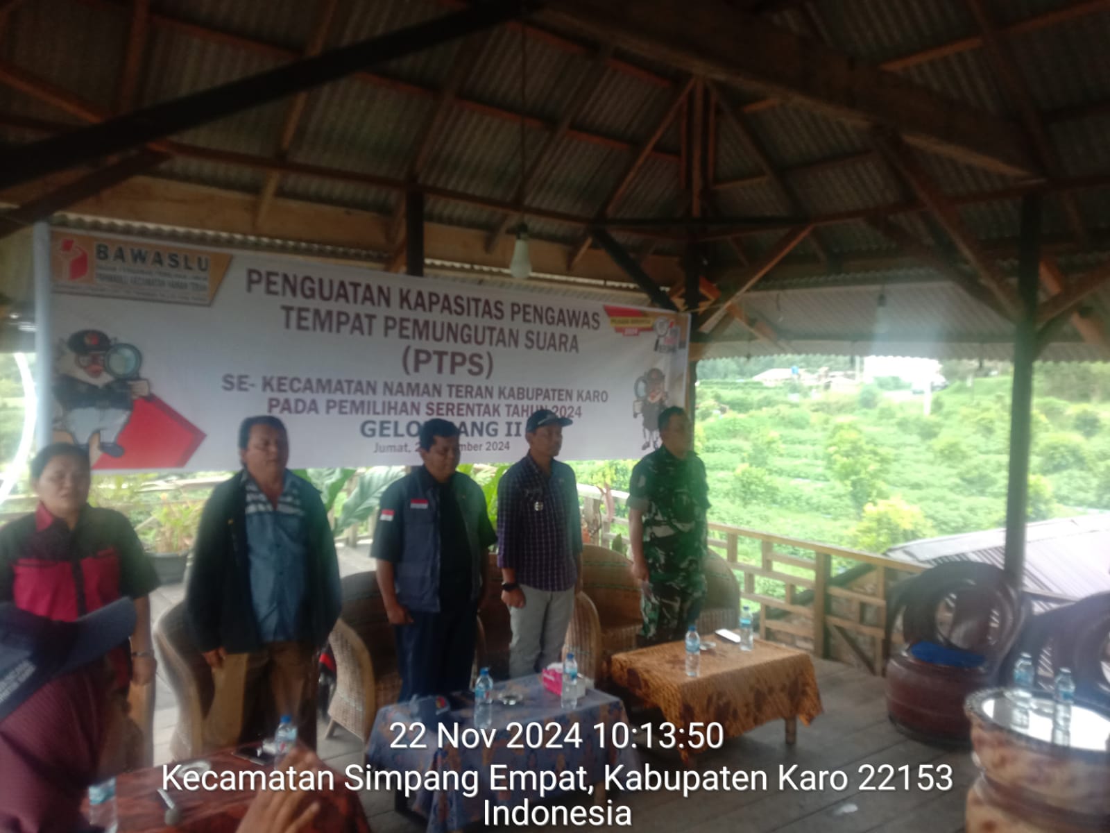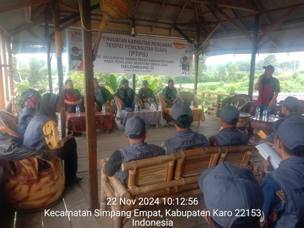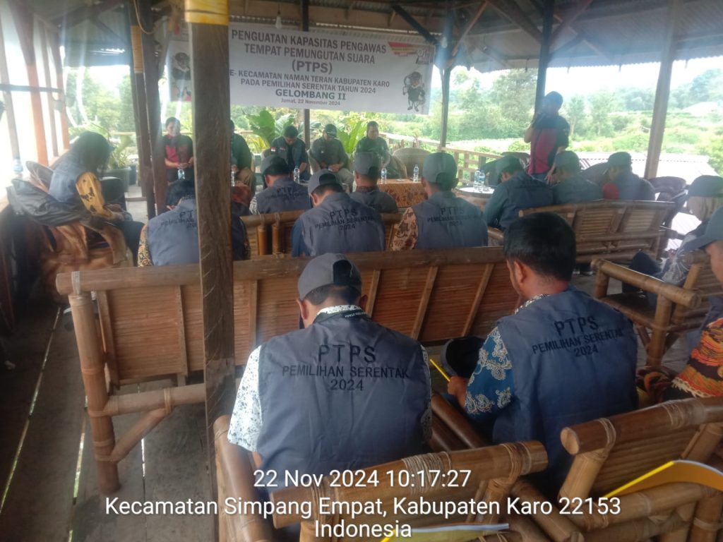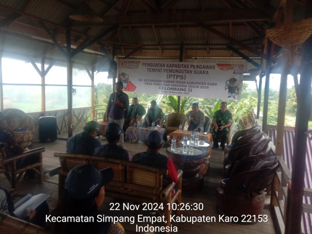 Tanah Karo. Jumat 22/11/2024.  Babinsa Koramil 04/Simpang Empat jajaran Kodim 0205/Tanah Karo Serma Martua Sihombing menghadiri acara Bimtek Penguatan Kapasitas Pengawas Tempat Pemungutan Suara (PTPS) Kecamatan Namanteran  pada Pilkada serentak Tahun 2024, bertempat di Cafe Sapo ButarJalan Laukawar Desa Sukandebi  Kecamatan Namanteran Kabupaten Karo-Sumatera Utara (22/11).
