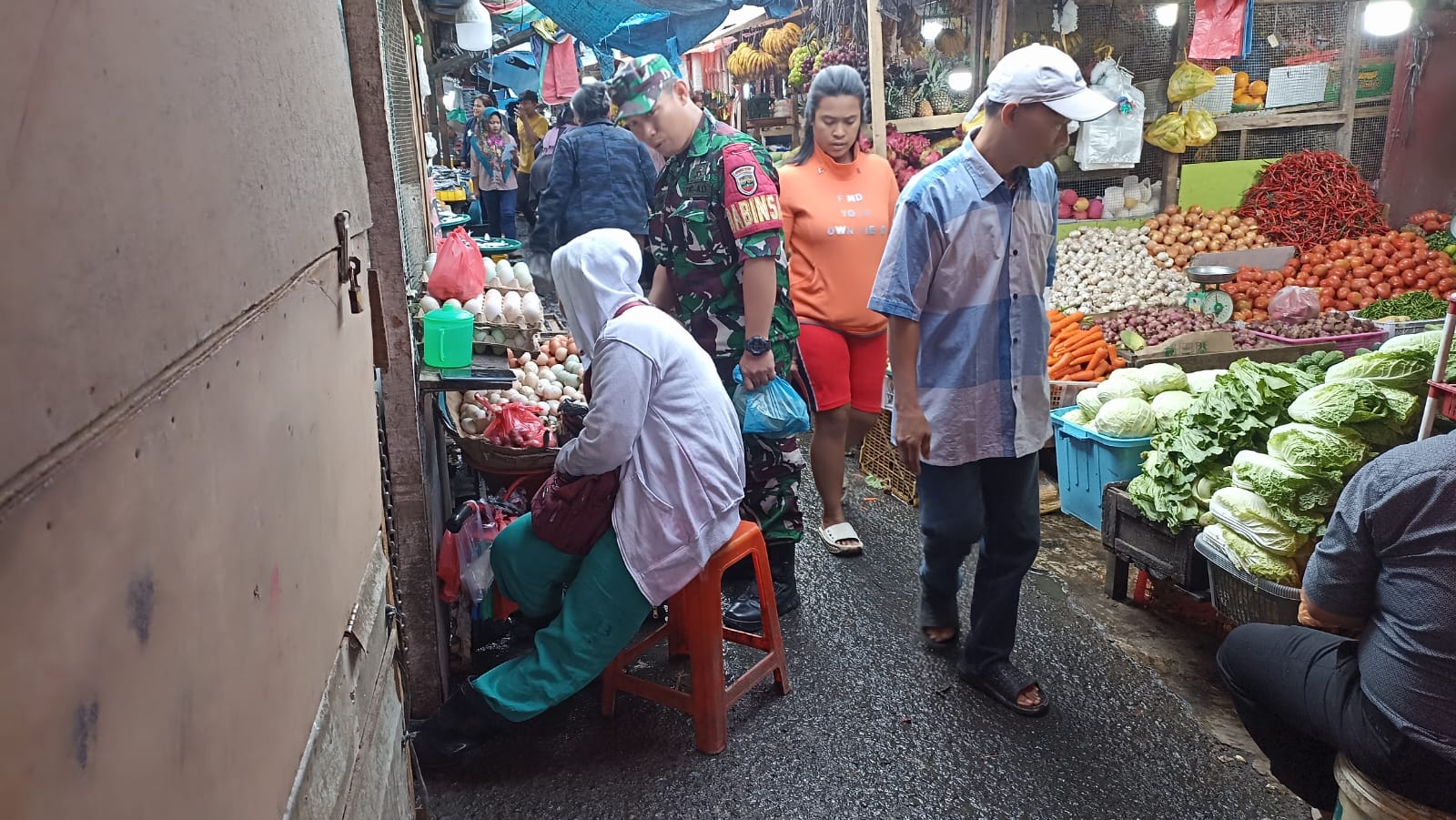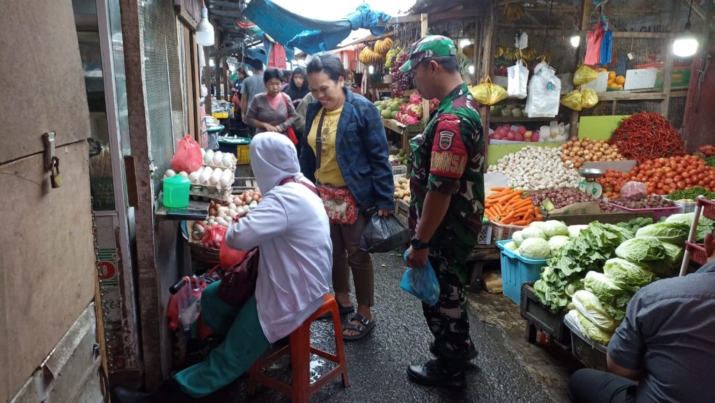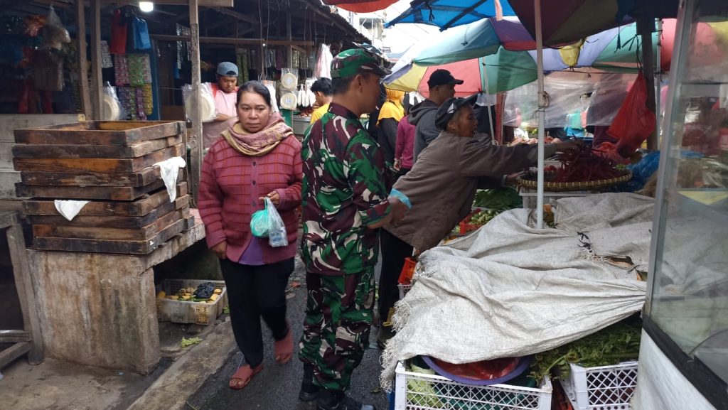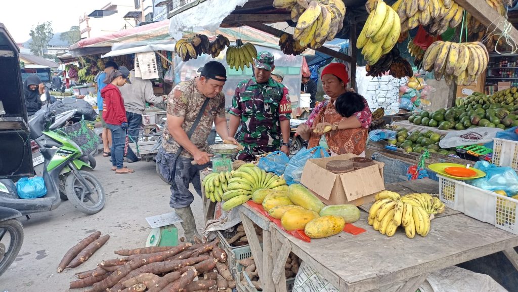 Tanah Karo. Jumat 06/12/2024. Di Pusat Pasar Berastagi yang berada di Kelurahan Tambak Laumugap-I dan Kelurahan Tambak Laumugap-II Kecamatan Berastagi Kabupaten Karo-Sumut, Serka Muryono Imam yang bertugas sebagai Babinsa (Bintara Pembina Desa) Koramil 03/Berastagi jajaran Kodim 0205/Tanah Karo pagi ini (06/12) selesai apel pagi melanjutkan kegiatan Patrol Wilayah Binaan dan Komunikasi social juga Monitoring pengecekan harga dan ketersediaan stok bahan pangan terutama Sembako.