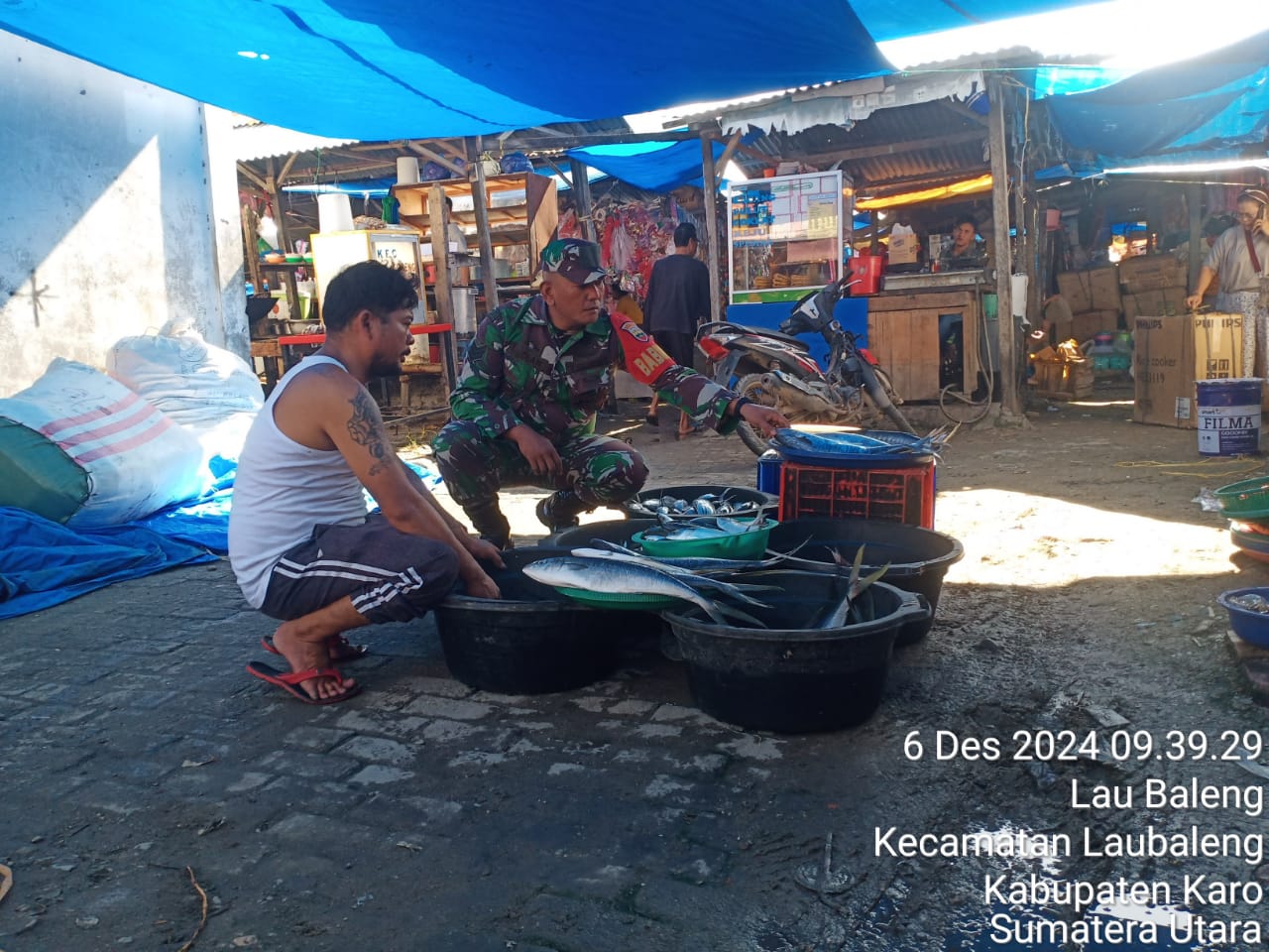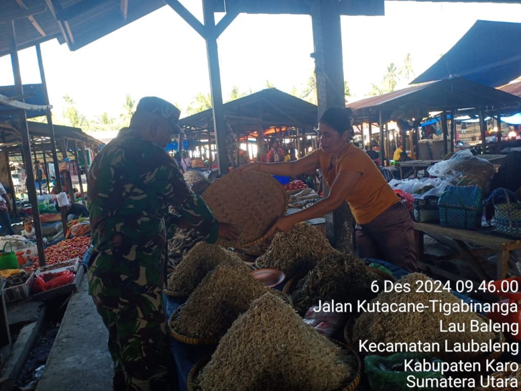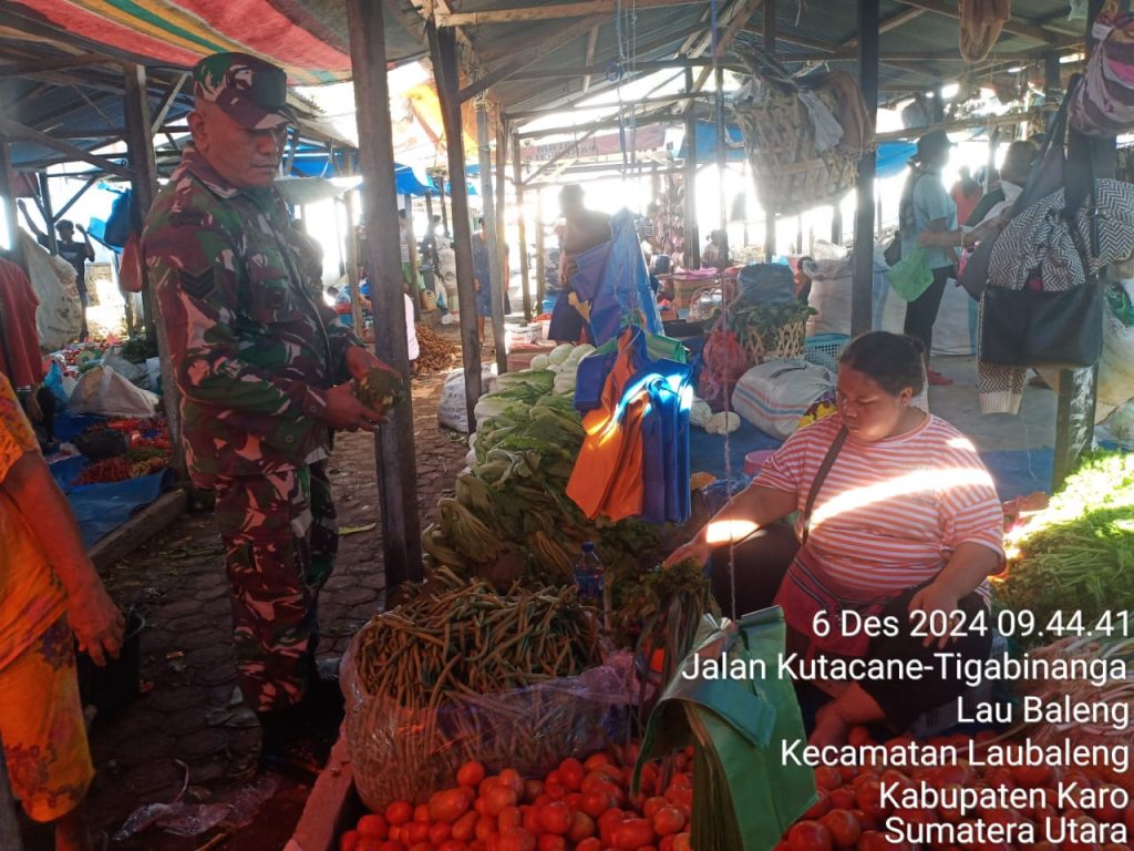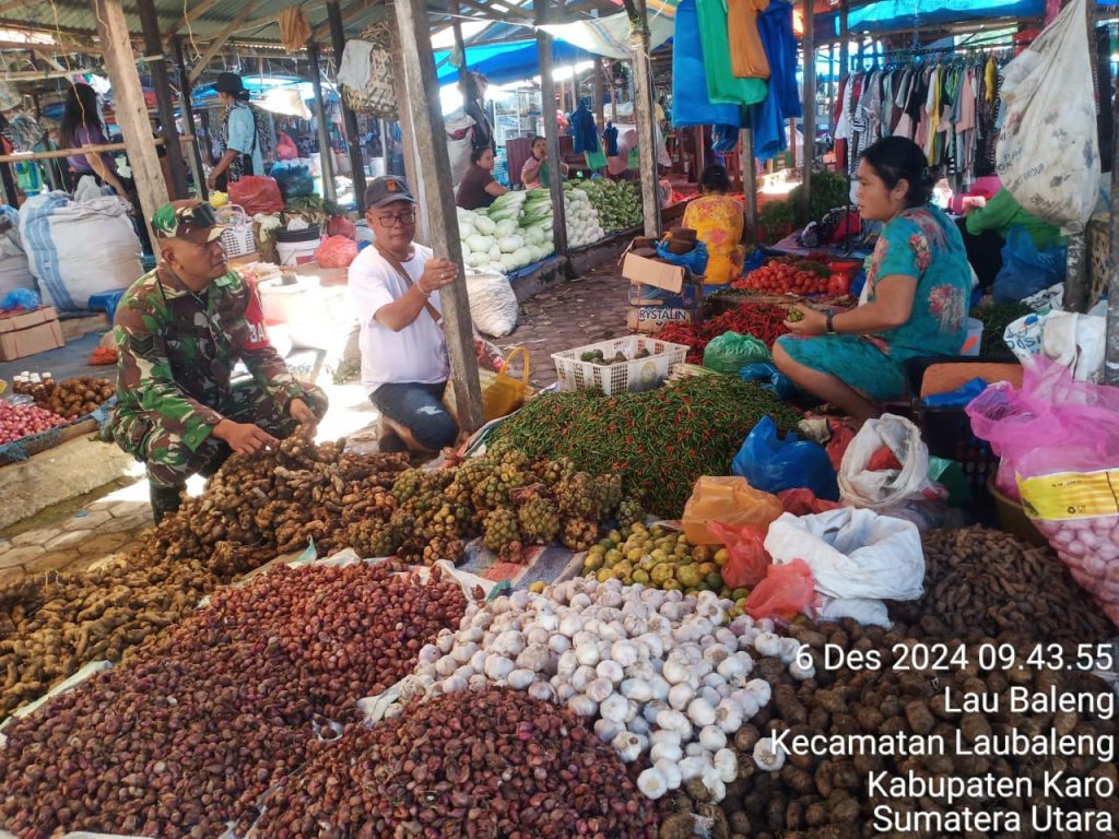 Hari ini (06/12) kegiatan tersebut juga dilaksanakana oleh Serka M. Dian bertugas sebagai Babinsa di Koramil 09/Laubaleng melaksanakan Patroli Wilayah Binaan, Komsos bersilaturahmi humanis dan monitoring mengecek secara langsung harga serta ketersediaan bahan pangan terutama Sembako yaitu beras, minyak goreng/mentega, telur, gula pasir, juga susu, daging ayam dan daging sapi termasuk LPG 3 Kg maupun sayur mayur, buah-buahan, rempah-rempah, air minuman kemasan, mie instan dan biscuit di Pasar Tradisonal Laubaleng Kecamatan Laubaleng Kabupaten Karo-Sumatera Utara.