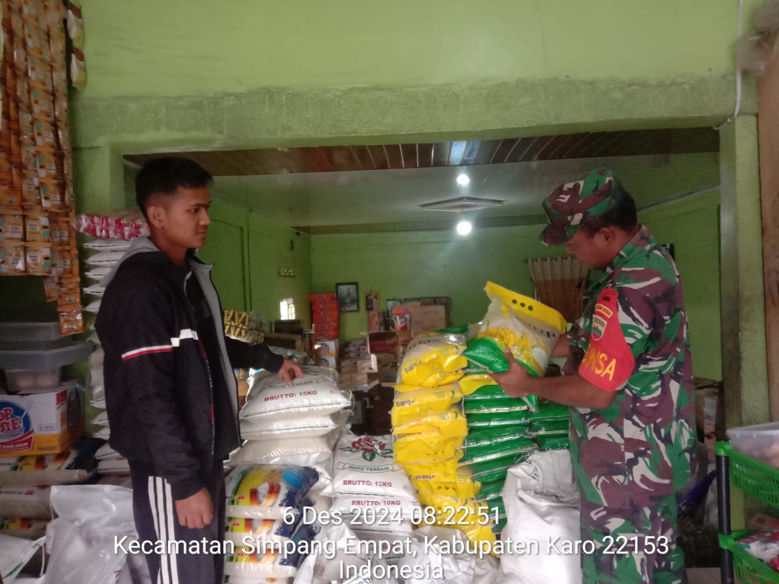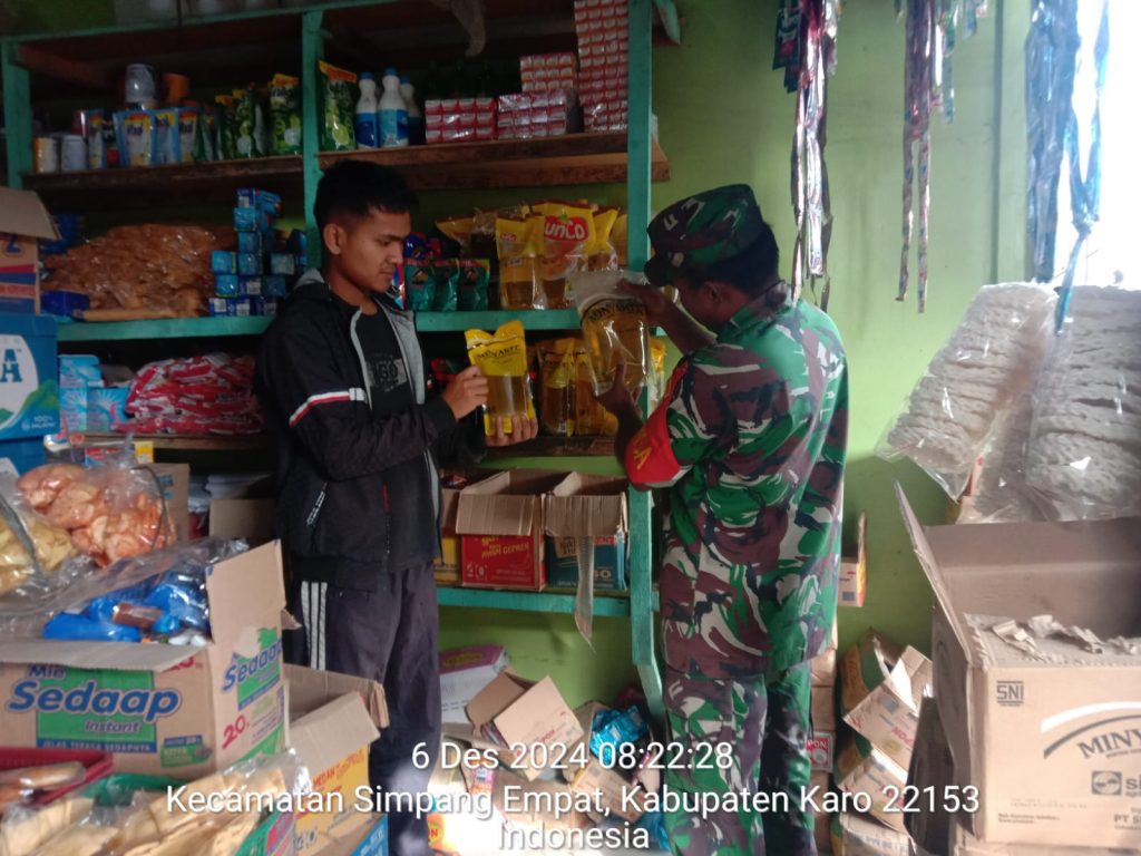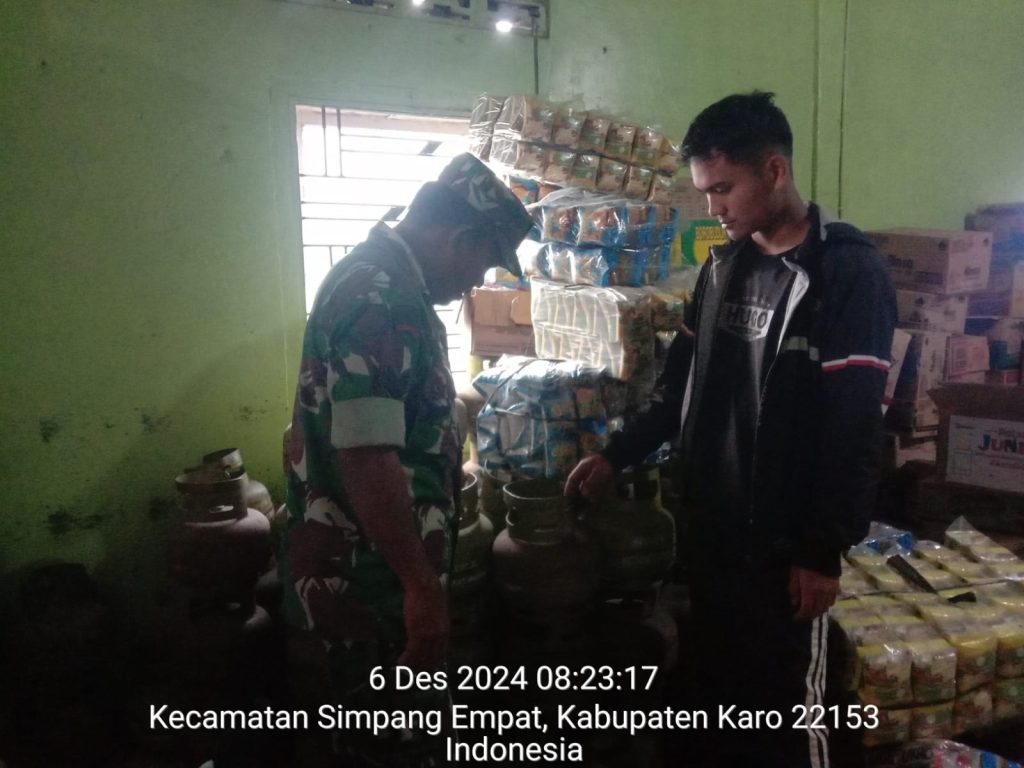 Serka Sudino Sihombing juga sebagai Babinsa di Koramil 04/Simpang Empat melaksanakan Komsos pencengecekan untuk monitoring harga dan stok bahan pangan terutama Sembako (Sembilan bahan pokok) kebutuhan masyarakat di wilayah binaan yaitu di Toko Bahan Pangan milik Ibu Yuni Beru Ginting di Jalan Tiganderket-Berastagi Desa Ndokum Siroga Kecamatan Simpang Empat Kabupaten Karo-Sumatera Utara sasaran pengecekan adalah ketersediaan beras, telur, minyak goreng, tepung terigu, gula pasir, susu, garam, ikan kaleng, LPG 3 Kg, termasuk air mineral kemasan, mie instan dan biscuit.