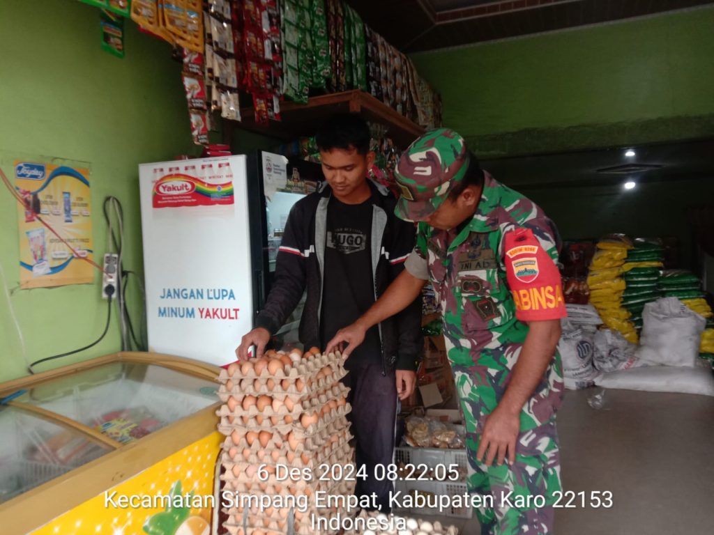 Tanah Karo. Jumat 06/12/2024. Danramil 04/Simpang Empat jajaran Kodim 0205/Tanah Karo Kapten Czi Menson Tarigan perintahkan para Babinsanya (Bintara Pembina Desa) termasuk anggota lainnya agar dalam melaksanakan komunikasi sosial dan patroli wilayah binaan juga memonitoring stok dan harga Sembako atau Sembilan Bahan Pokok (Sembako) di desa binaan masing-masing guna memastikan kebutuhan pangan masyarakat di wilayah binaan terpenuhi.