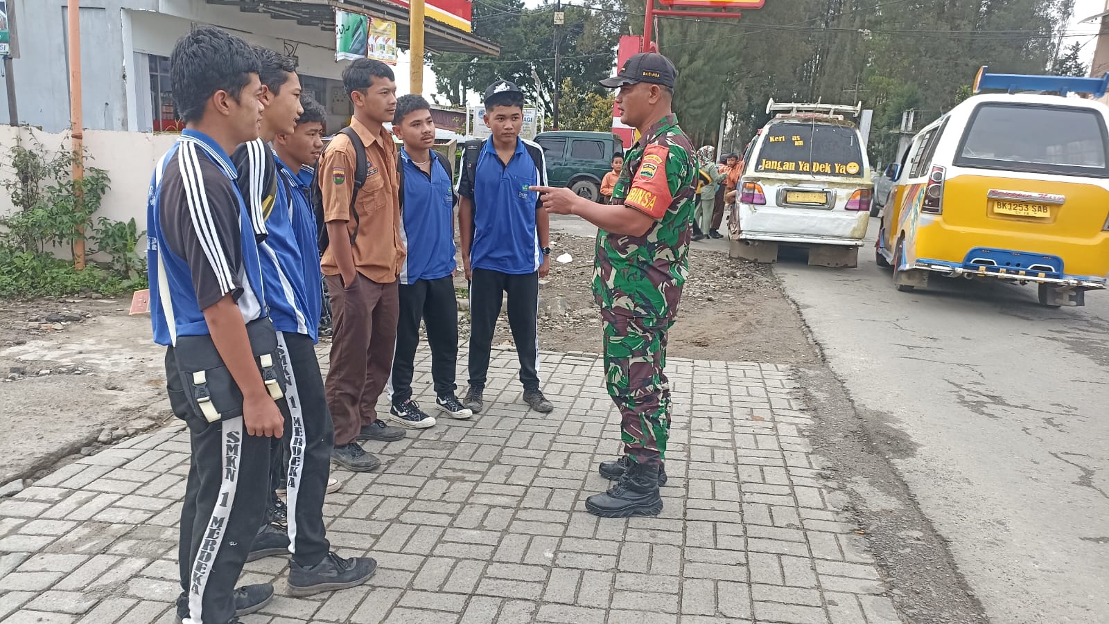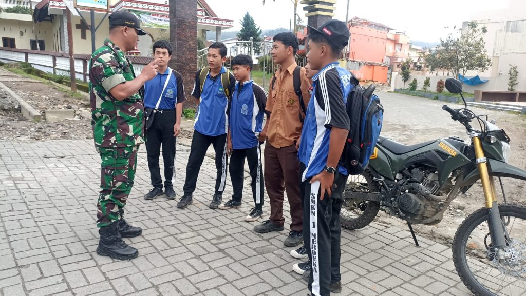 Tanah Karo. Sabtu 07/12/2024. Kegiatan Komsos (Komunikasi sosial) bersilaturahmi yang dilaksanakan oleh Sertu Hendro Gultom bertugas sebagai Babinsa (Bintara Pembina Desa) di Koramil 03/Berastagi jajaran Kodim 0205/Tanah yaitu dengan Siswa SMK Negeri 1 Merdeka sambil memberikan motivasi semangat belajar bertempat di jlaan menuju sekolah Kelurahan Gundlaing-I Kecamatan Berastagi Kabupaten karo-Sumatera Utara (07/12) pagi.