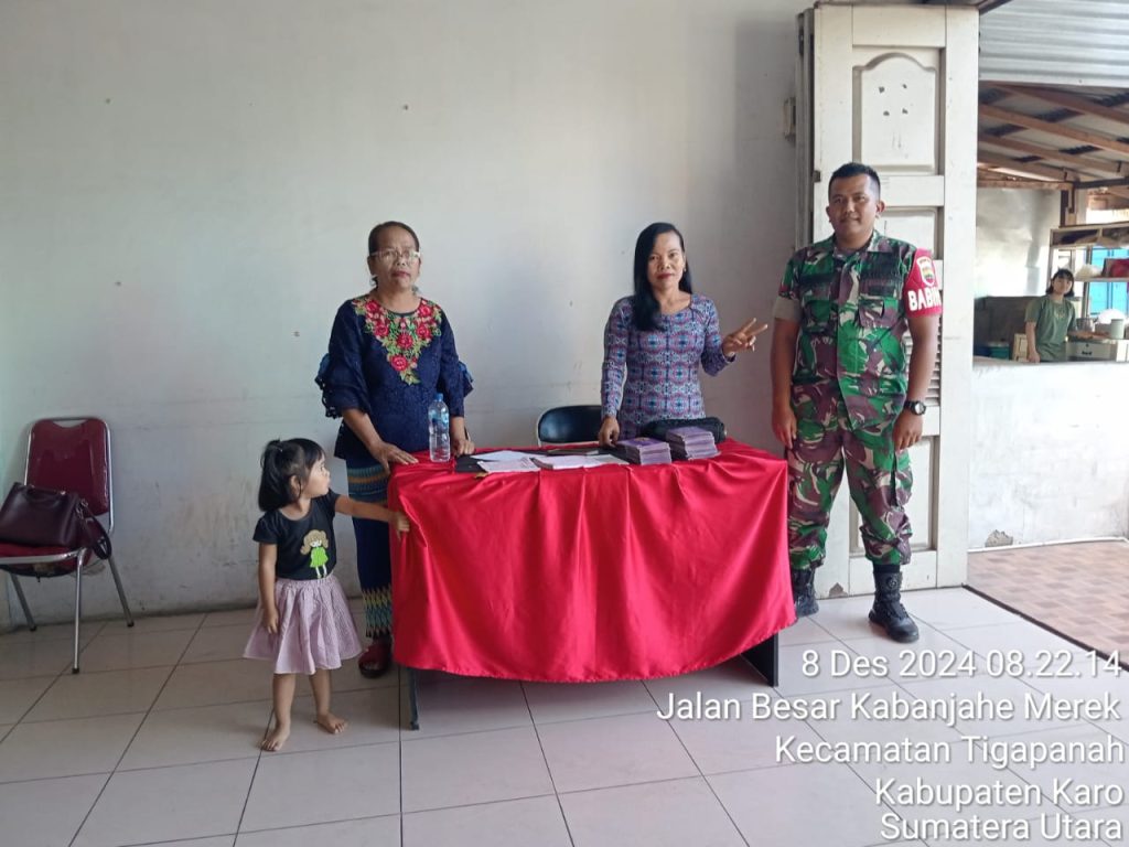 Tanah Karo. Minggu 08/12/2024. Danramil 02/Tigapanah jajaran Kodim 0205/Tanah Karo Kapten Inf Judika Naibaho perintahkan para Babinsanya agar membantuan pihak Majelis Gereja dalam rangka kegiatan Pengamanan Ibadah Kebaktian Minggu di wilayah binaan sambil silaturahmi dalam rangka Komunikasi Sosial (Komsos) di wilayah binaan, termasuk Ibadah Kebaktian Minggu di GBI (Gereja Bethel Indonesia) Tigapanah pada hari minggu ini (08/12) oleh Kopdsa Habiron Ginting juga bertugas sebagai Babinsa.