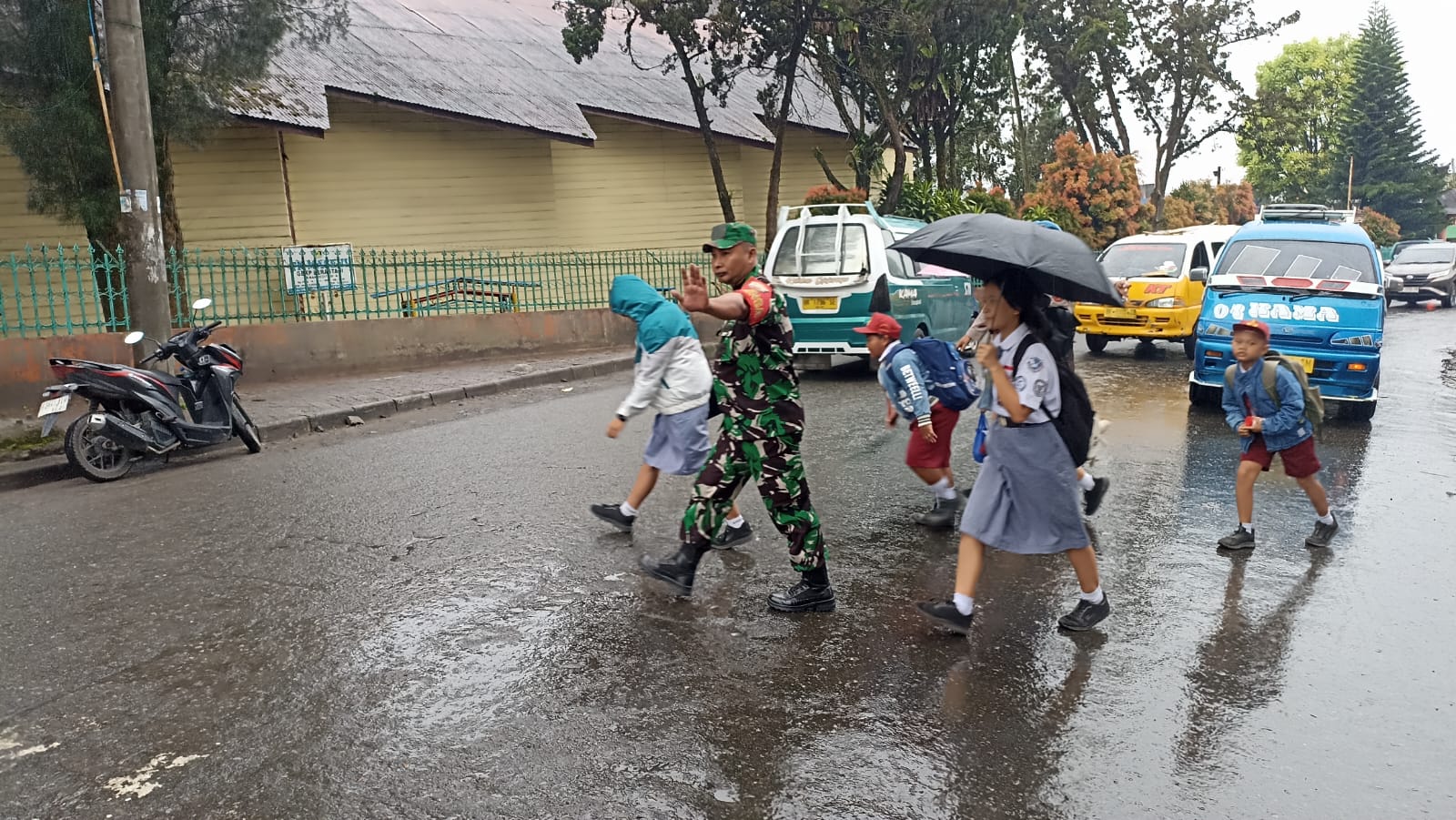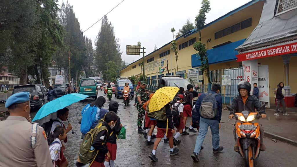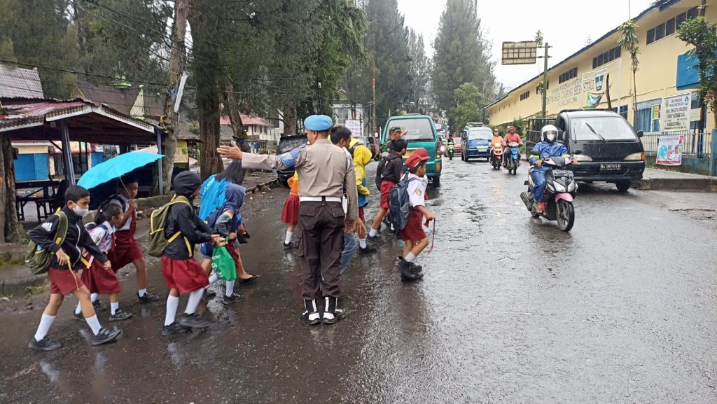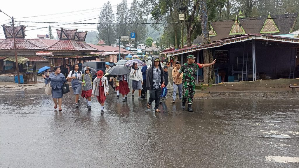 Tanah Karo. Senin 09/12/2024. Perhatian terhadap warga wilayah binaan salahsatunya peduli akan keselamatan anak-anak sekolah maupun warga sehingga para Babinsa (Bintara Pembina Desa) di Koramil 03/Berastagi jajaran Kodim 0205/Tanah Karo termasuk Serka Irwansyah Tarigan turut serta Personel Polsek Berastagi Aipda Surbakti menyeberangkan siswa-siswi sekolah SD, SMP dan SMA Murid Sekolah Yayasan Masehi Berastagi juga mengatur lalulintas berlokasi di sekitar Komplek Sekolah Yayasan Masehi Berastagi Jalan Pasar Buah-Bukit Gundaling Kelurahan Gundaling-I Kecamatan Berastagi Kanbupaten Karo-Sumatera Utara (09/12) pagi saat masuk sekolah maupun siang saat pulang sekolah.