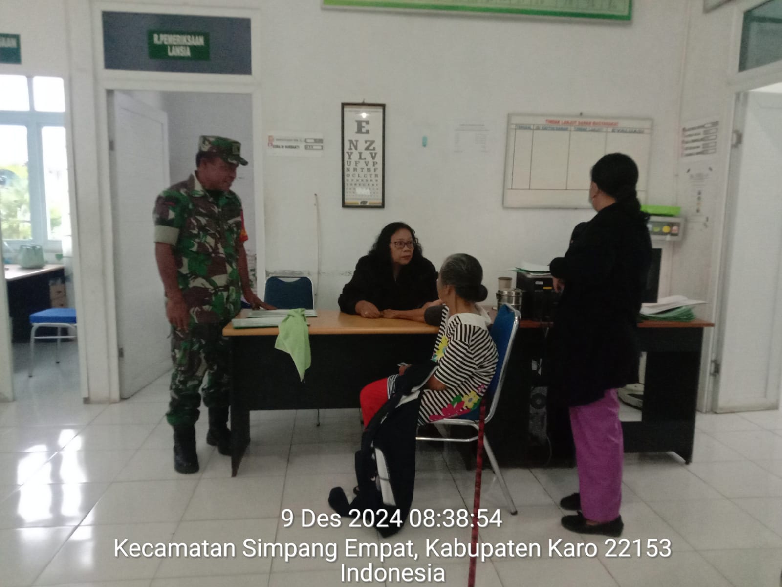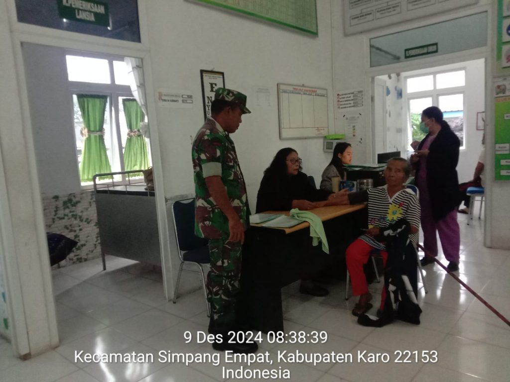 Tanah Karo. Senin 09/12/2024. Kapten Czi Menson Tariga selaku Danramil 04/Simpang Empat jajaran Kodim 0205/Tanah Karo perintahkan kepada para Babinsanya agar tetap melaksanakan kegiatan Patroli Wilayah Binaan dan Komunikasi Sosial, caranya pun beragam salahsatunya bersilaturahmi dan mengatar warga desa binaan yang sakit serta mengecek kesehatan ke tempat layan kesehatan baik Puskesmas, Klinik umum maupun ke Rumah sakit sambil bersilaturahmi dengan Tenaga Kesesatan atau Para Medis.