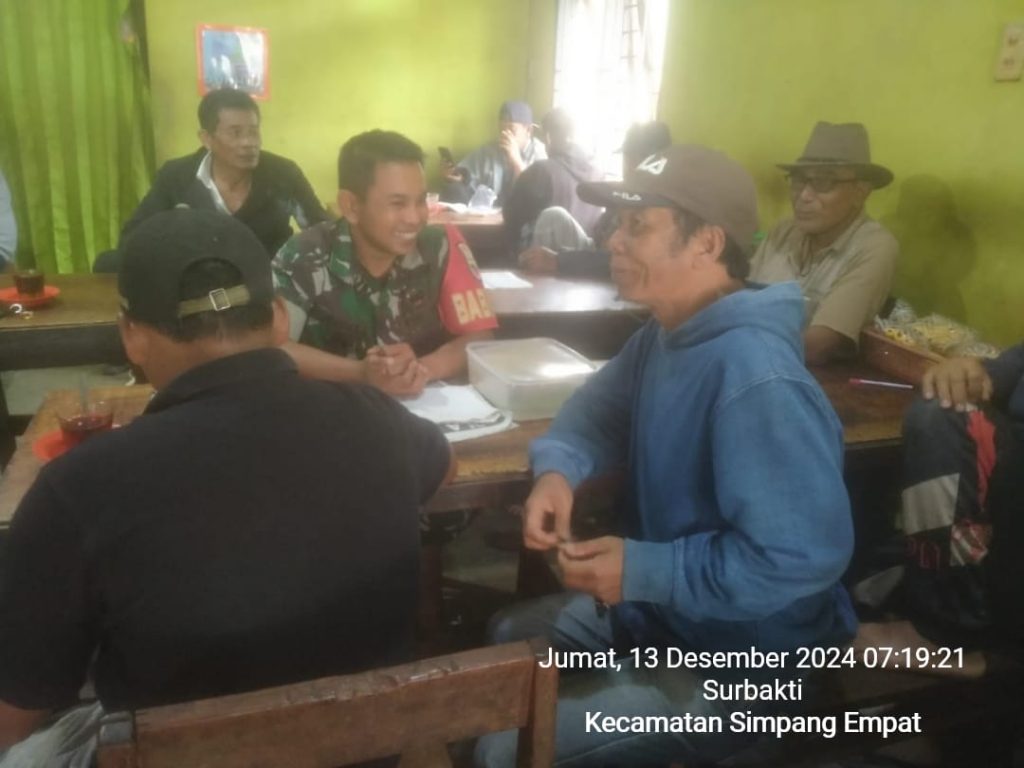 Hari inipun (13/12) kegiatan mengunjungi dan bersilaturahmi dengan warga sambil imbauan dilaksanakan Sertu Jemmy Rombe Lambaran sebagai Babinsa di Koramil 04/Simpang Empat jajaran Kodim 0205/Tanah Karo sesuai perintah dari Danramil Kapten Czi Menson Tarigan, sedangkan imbauan yang disampaikan adalah agar warga tetap menjaga keamanan dan ketertiban lingkungan, menjaga Kebersihan lingkungan terutama mengajak warga agar menjauhi Narkoba, hindari judi online dan judi offline serta menjaga kerukunan hidup antar warga dan menjaga toleransi antar umat beragama.