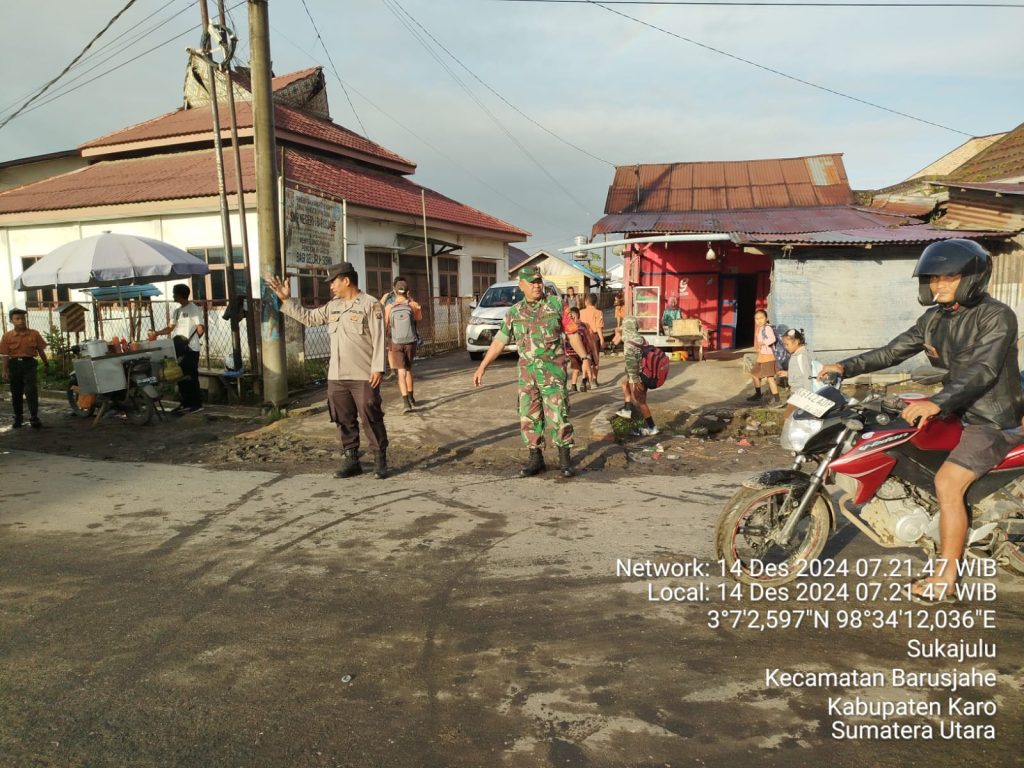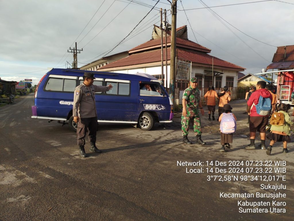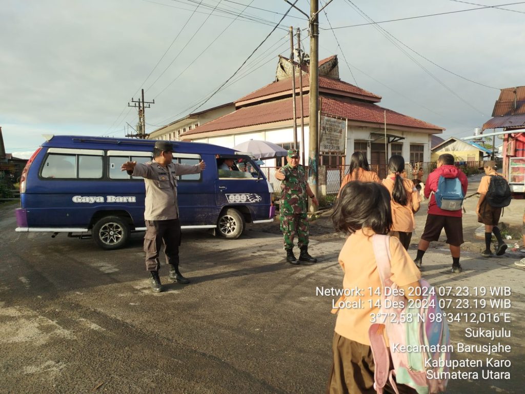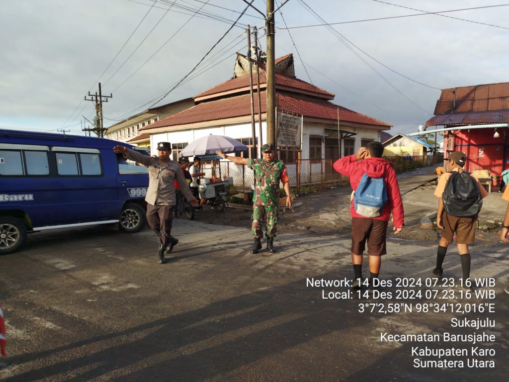 Tanah Karo. Sabtu 14/12/2024. Kepedulian terhadap masyarakat warga wilayah binaan dan bentuk perhatian akan keselamatan anak-anak sekolah maupun warga serta dalam menyikapi arus lalulintas mulai ramai sehingga Pelda Zulkarnain S. Meliala Babinsa Koramil 01/Barusjahe jajaran Kodim 0205/Tanah Karo bersama Personel Polsek Barusjahe jajaran Polres Tanah Karo Aiptu T. Ginting menyeberangkan para anak-anak sekolah dan mengatur lalulintas di Simpang Tigajumpa Jalan Tigapanah Tongkoh dan Jalan Gotong Royong Desa Sukajulu Kecamatan Barusjahe Kabupaten Karo-Sumatera Utara.