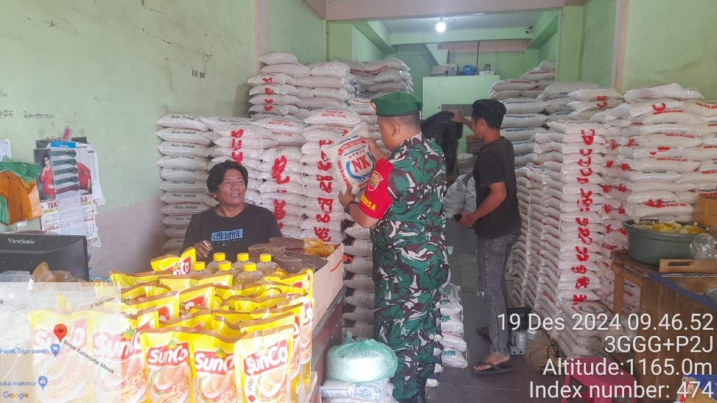 Tanah Karo. Kamis 19/12/2024. Guna memastikan ketersediaan stok dan harga bahan pangan terutama Sembako menjelang perayana Nataru (Natal 25 Desember 2024 dan Tahun Baruj 1 Januari 2025) di wilayah binaan terpenuhi, Kapten Inf Judika Naibaho selaku Danramil 02/Tigapanah  jajaran Kodim 0205/Tanah Karo perintahkan anggota para Babinsanya (Bintara Pembina Desa) melaksanakan Komsos (Komunikasi sosial) dan Pawilbin (Patroli wilayah binaan) juga memonitoring di desa/wilayah binaan masing-masing.
