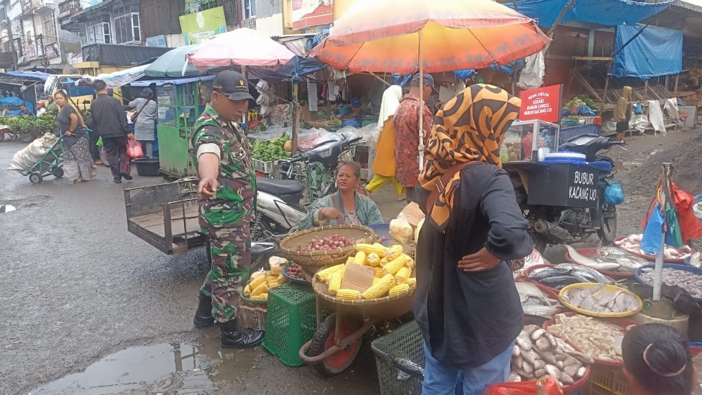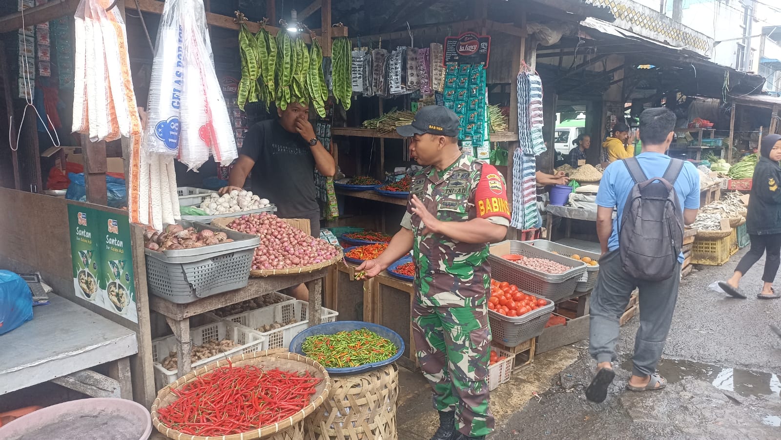 Sertu Irwansyah juga bertugas di Koramil 03/Berastagi sebagai Babinsa pada hari ini (21/12) juga sesuai perintah Danramil untuk melaksanakan Pawilbin dan Komsos di wilayah binaan sambil monitoring mengecek secara langsung harga dan ketersediaan bahan pangan terutama Sembako yaitu beras, minyak goreng/mentega, telur, gula pasir, dan susu maupun LPG 3 Kg serta mengecek ketersediaan sayur-mayur, buah-buahan, rempah-rempah, daging dan ikan laut di Pusat Pasar Berastagi Kelurahan Tambak Lau Mulgap-I dan Tambak Lau Mulgap-II Kecamatan Berastagi Kabupaten Karo-Sumut.