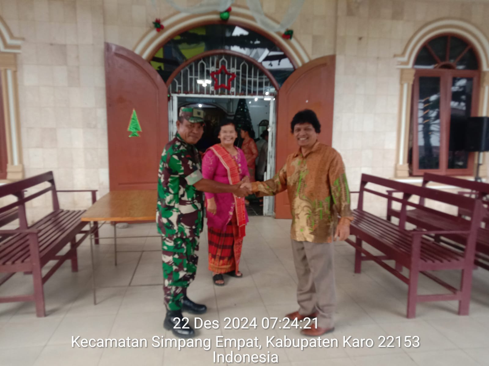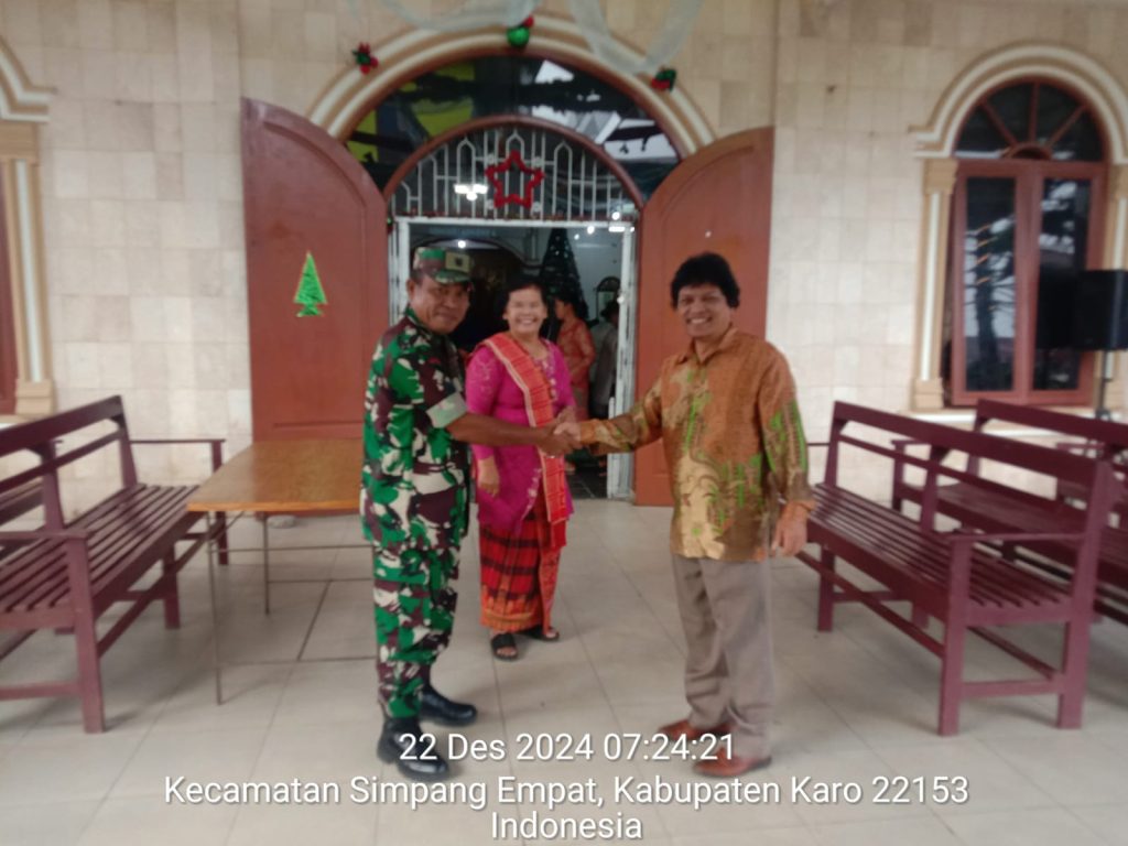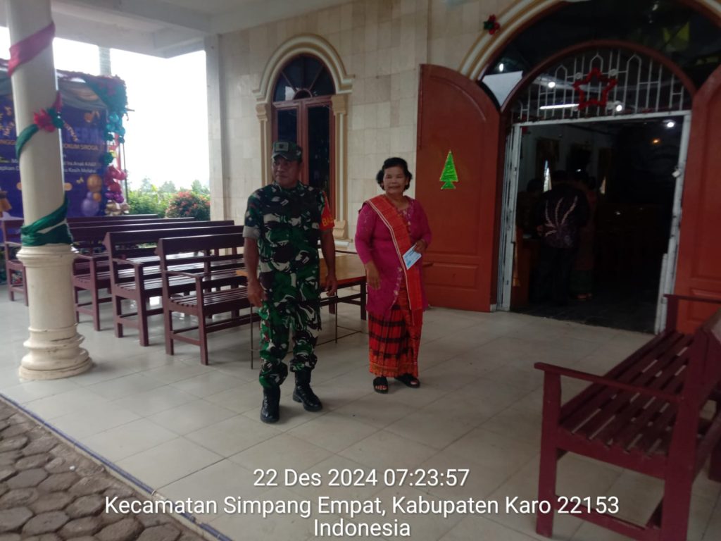 Tanah Karo. Minggu 22/12/2024. Serka Sudino Sihombing yang bertugas sebagai Babinsa di Koramil 04/Simpang Empat jajaran Kodim 0205/Tanah Karo membantu Majelis GBKP (Gereja Batak Karo Protestan) Ndokum Siroga alam pelaksanaan Pengamanan Ibadah Kebaktian Minggu Minggu di Gereja Jalan Udara Beratagi-Tiganderket Desa Ndokum Siroga Kecamatan Simpang Empat Kabupaten Karo-Sumatera Utara sesuai perintahkan Danramil Kapten Czi Menson Tarigan.