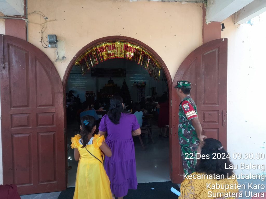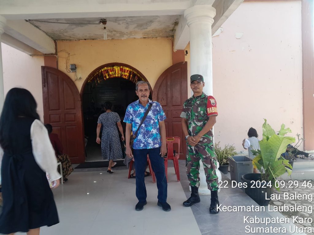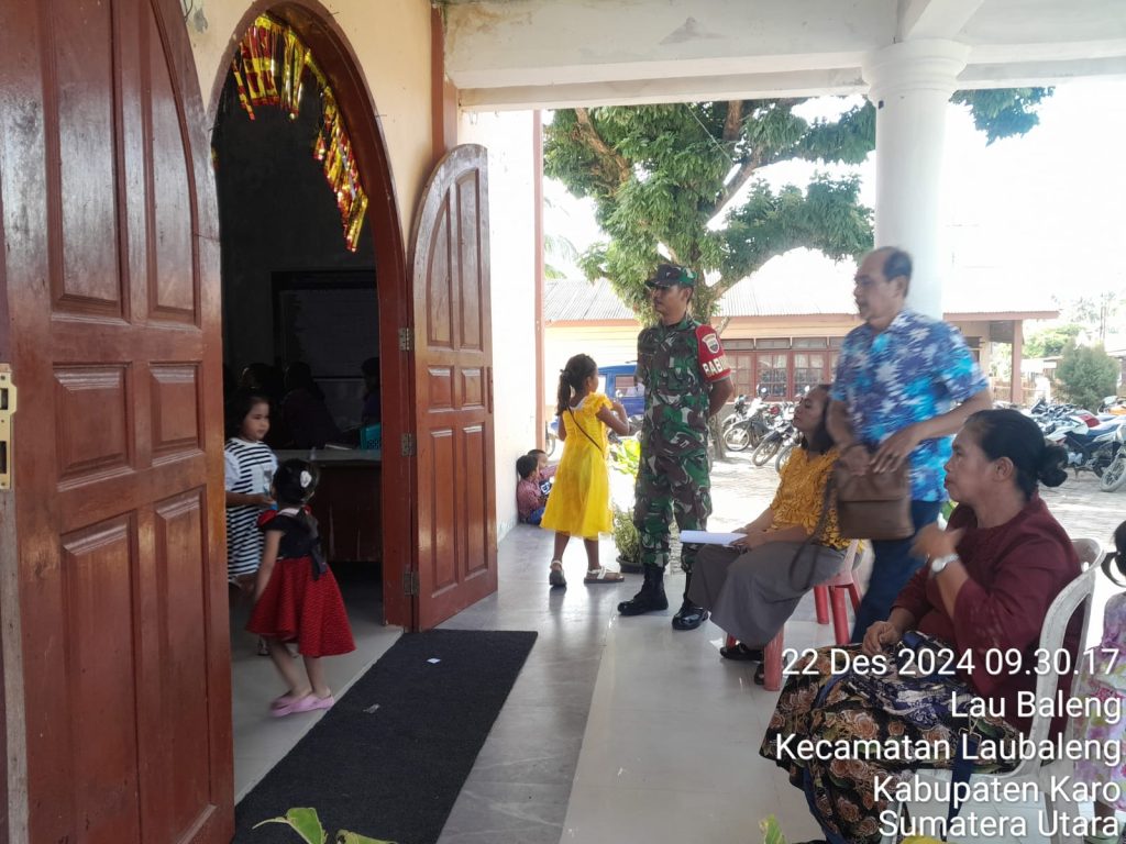 Tanah Karo. Minggu 22/12/2024. Kegiatan Pengamanan Ibadah Kebaktian Minggu sambil Komunikasi Sosial (Komsos) juga menyampaikan imbauan menjaga keamanan dan ketertiban lingkungan, menjaga kebersihan lingkungan serta menjaga kerukunan hidup antar warga di GBKP (Gereja Batak Karo Protestan) Laubaleng Jalan Kuta Cane Desa Laubaleng Kecamatan Laubaleng Kabupaten Karo-Sumut dilaksanakan Kopda Wais Qarni yang bertugas sebagai Babinsa di Koramil 09/Laubaleng jajaran Kodim 0205/Tanah Karo (22/12).