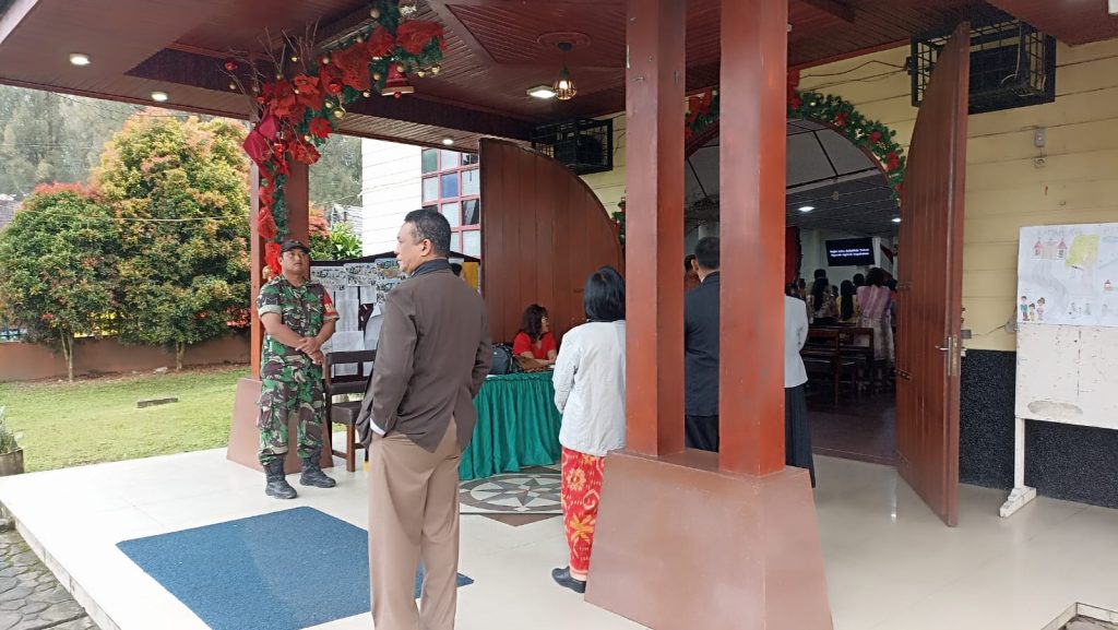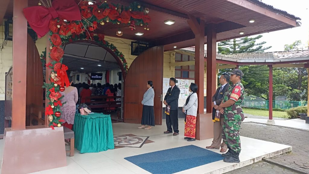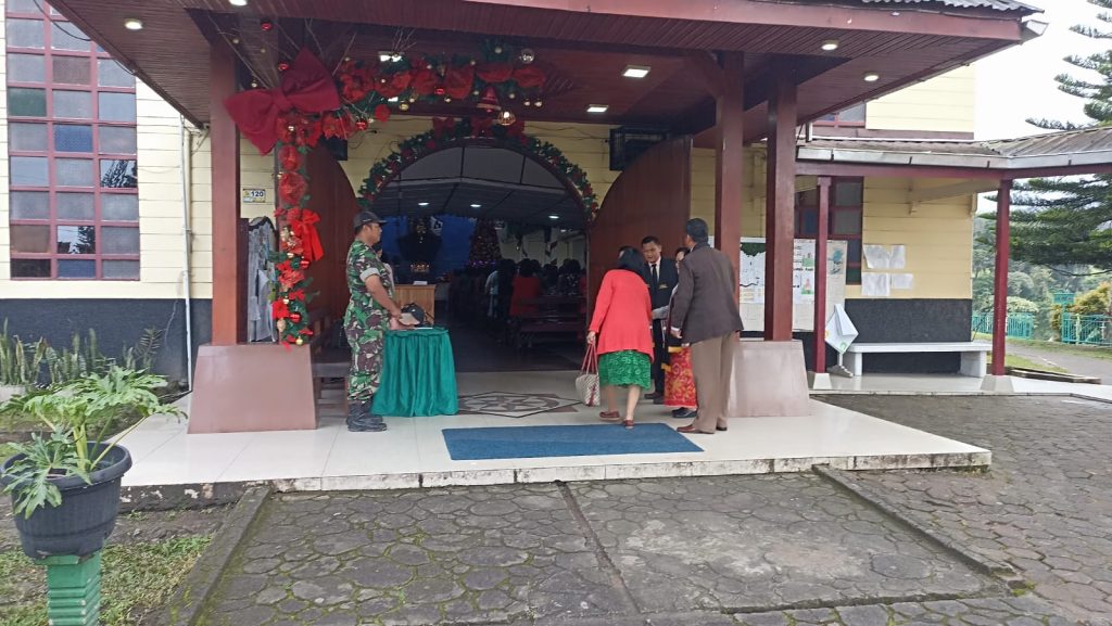 Tanah Karo. Minggu 22/12/2024. Danramil 04/Simpang Empat jajaran Kodim 0205/Tanah Karo Mayor Cke Thamrin Vincent Bangun perintahkan walaupun hari libur agar tetap para Babinsanya termasuk Serka Sujianto dan Serda Arif Hidayat agar tetap melaksanakan Partoli Wilayah Binaan dan Komunikasi Sosial, setelah itu melaksanakan Pam Ibadah Kebaktian Minggu sambil imbauan menjaga keamanan dan ketertiban lingkungan, menjaga kebersihan lingkungan dan tetap menggiatkan jaga Siskamling, menjaga kerukunan hidup antar warga serta waspada bencana alam sambil Pengamanan Ibadah Kebaktian Minggu bersama Majelis GBKP (Gereja Batak Karo Protestan) Kota Berastagi Jalan Bukit Gundaling Kelurahan Gundaling-I Kecamatan Berastagi Kabupaten Karo-Sumut (22/12).