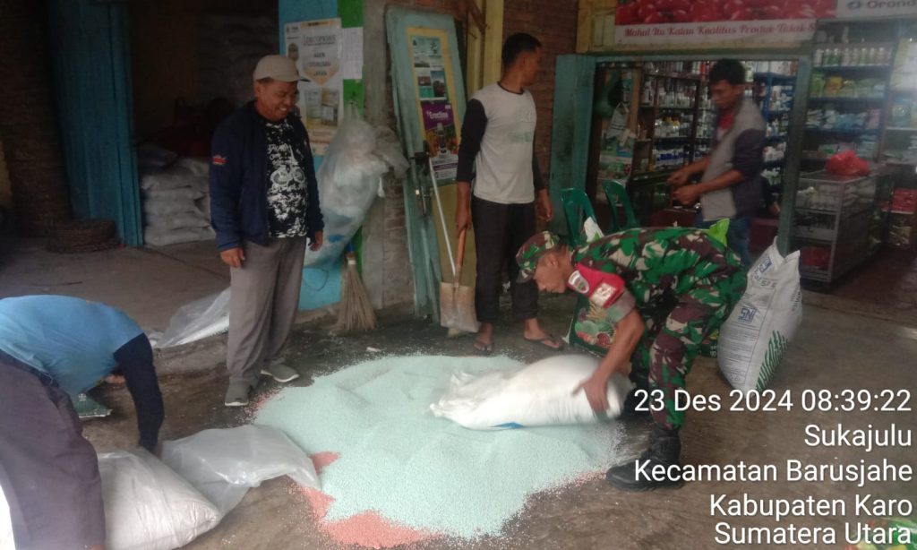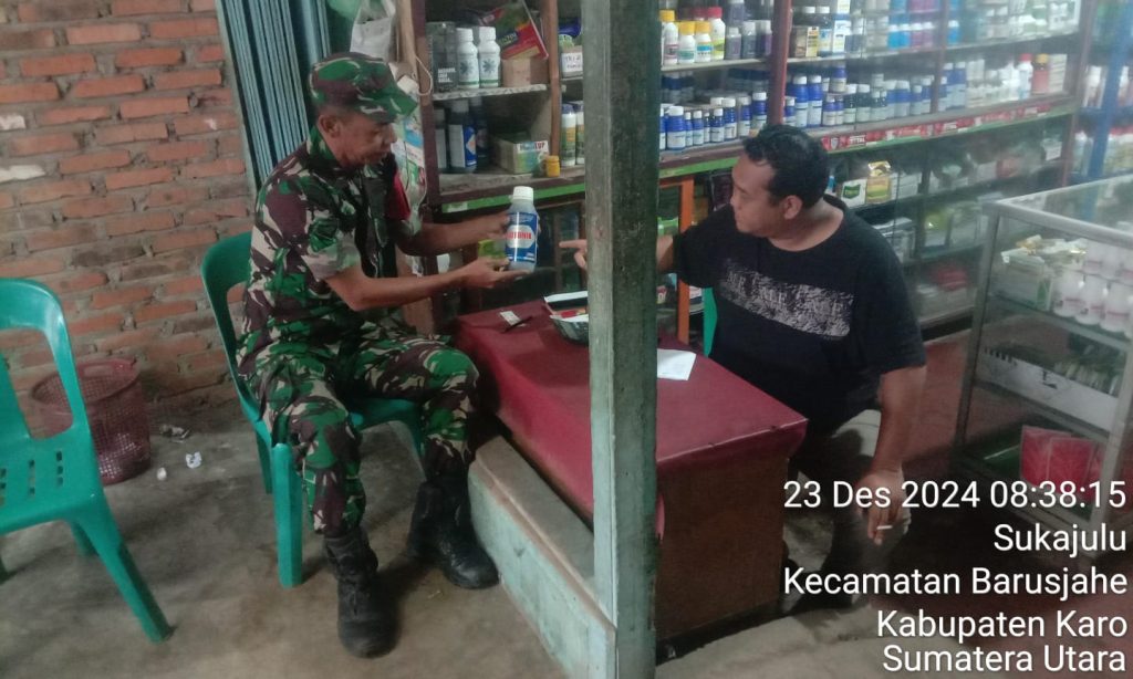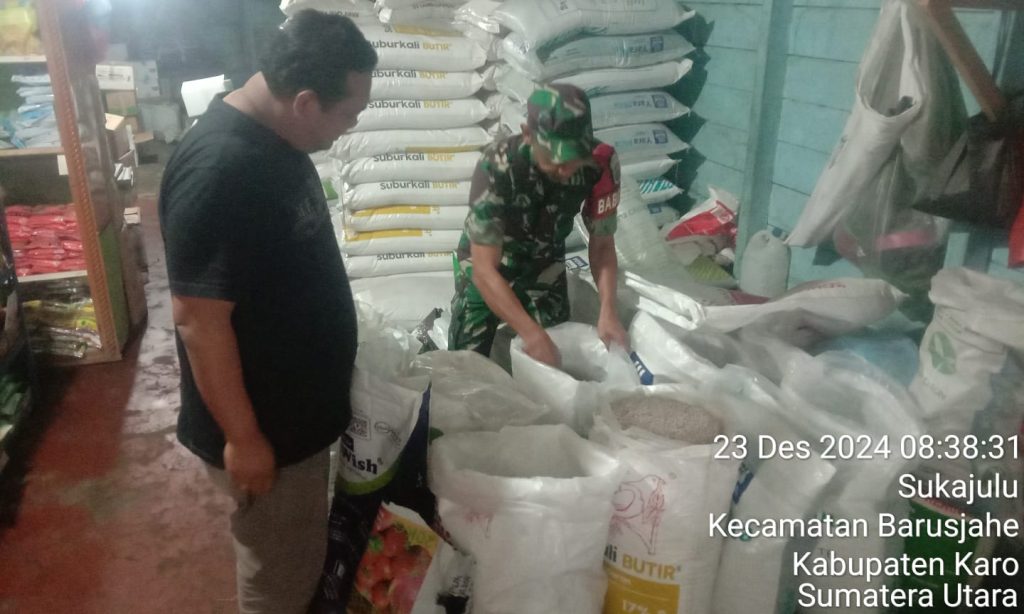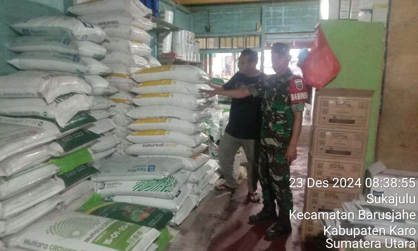 Tanah Karo. Senin 23/12/2024. Serda Yayat Sudrajat bertugas sebagai Babinsa di Koramil 01/Barsujahe jajaran Kodim 0205/Tanah Karo dalam melaksanakan kegiatan komunikasi sosial, sambil Upsus Program Ketahanan Pangan Nasional yaitu melakukan monitoring harga dan ketersediaan stok pupuk juga obat-obatan pertanian di Toko Pertanian UD. TARSIL milik Bapak Eben Tarigan Silangit yang berada di Jalan Tigapanah-Tongkoh Desa Sukajulu Kecamatan Barusjahe Kabupaten Karo-Sumatera Utara.