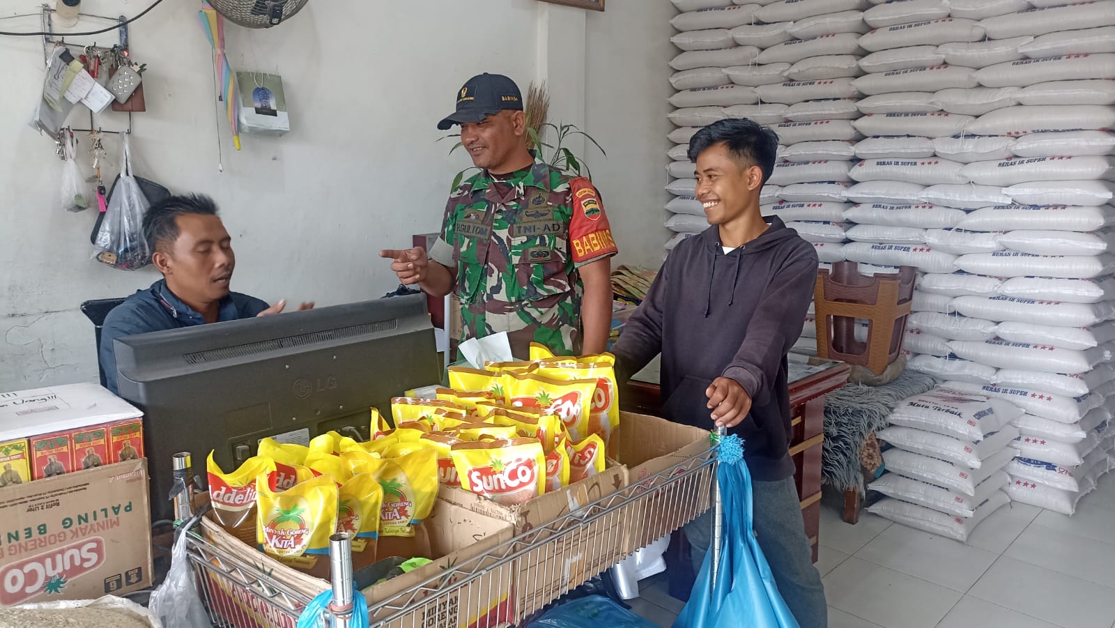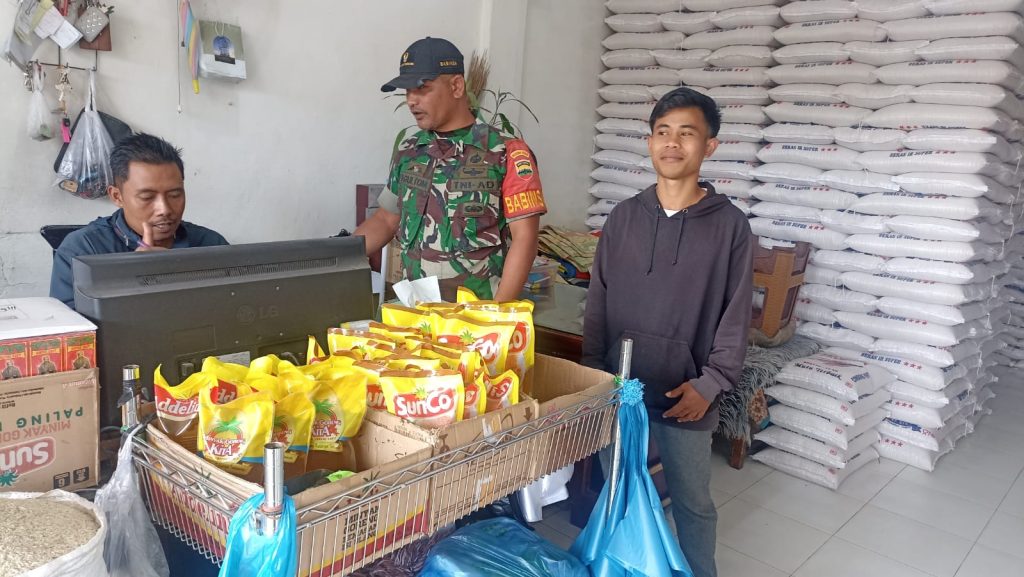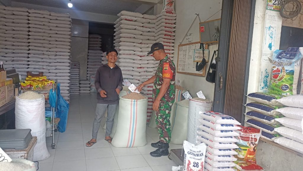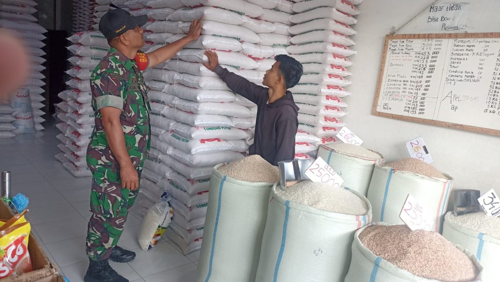 Tanah Karo. Selasa 24/12/2024. Jelang Natal 25 Desember 2024 Babinsa Koramil 03/Berastagi jajaran Kodim 0205/Tanah Karo Sertu Hendro Gultom melaksanakan Patroli Wilayah Binaan (Pawilbin) dan Komunikasi Sosial (Komsos)bersialturahmi sdecara humanis sambil melakukan monitoring pengecekan stok beras di Grosir Beras UD. Jesika Bunga Padi Berastagi di Pusat Pasar Berastagi Kelurahan Tambak Lau Mulgap-II Kecamatan Berastagi Kabupaten Karo-Sumatera Utara (24/12) pagi hingga siang.
