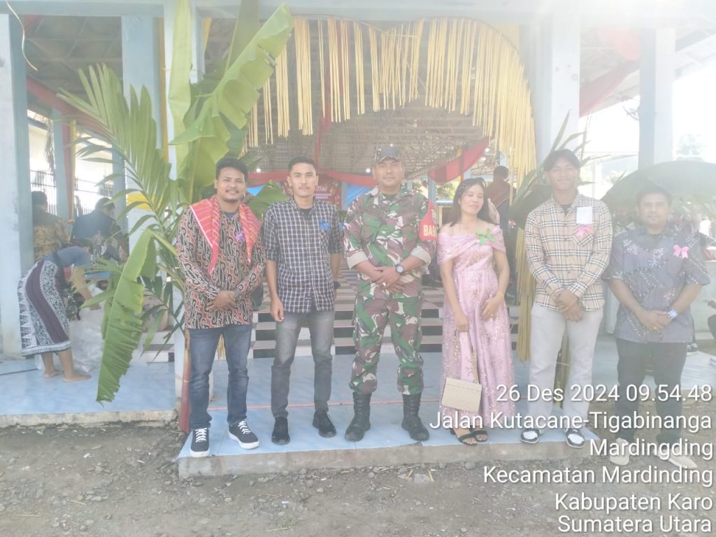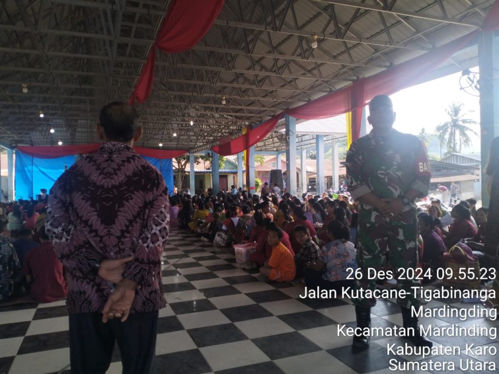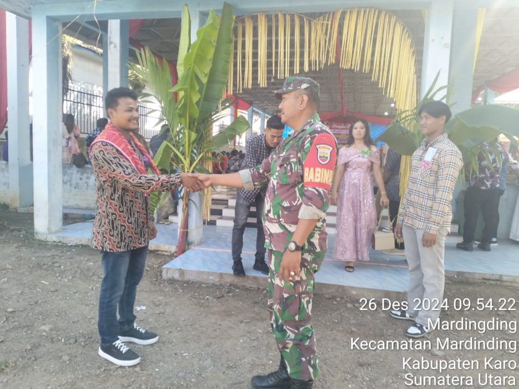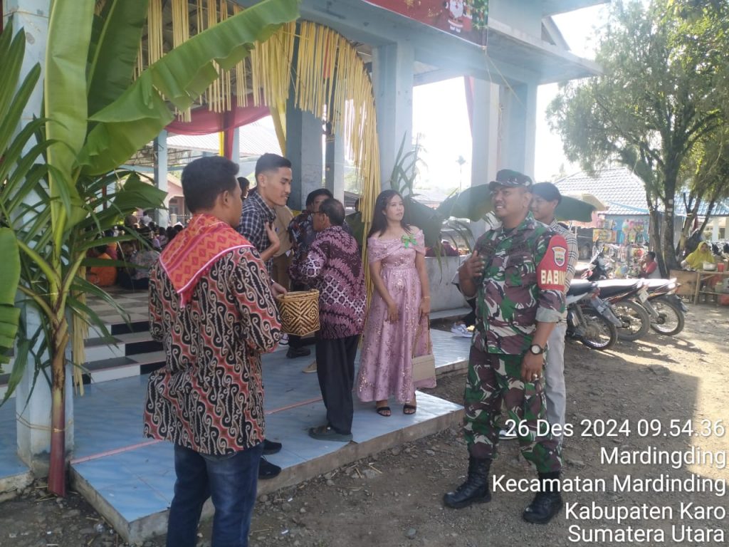 Hari inipun (26/12) walapun hari libur Danramil 09/Laubaleng Kapten Inf Gandhi N. Hartanto perintahkan para Babinsanya untuk tetap melaksanakaan Komunikasi Sosial bersilaturahmi dan Pengamanan Ibadah Perayaan Natal 2024 di Gereja  ataupun tempat perayaan yang ada di wilayah binaan masing-masing, seperti yang dilaksanakan oleh Serka Hartono Pinim dan Srka M. Dian sabagai para Babinsanya, dalam kegiatan ini membantu Panitian Natal pada pengamanan Perayan Natal Gereja Katholik Mardingding di Jambur/Balai Desa Jalan Kutacane Desa Mardingding Kecamatan Mardingding Kabupaten Karo-Sumatera Utara.