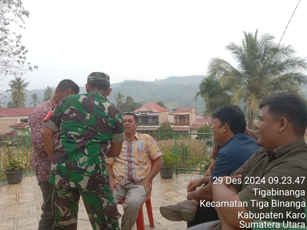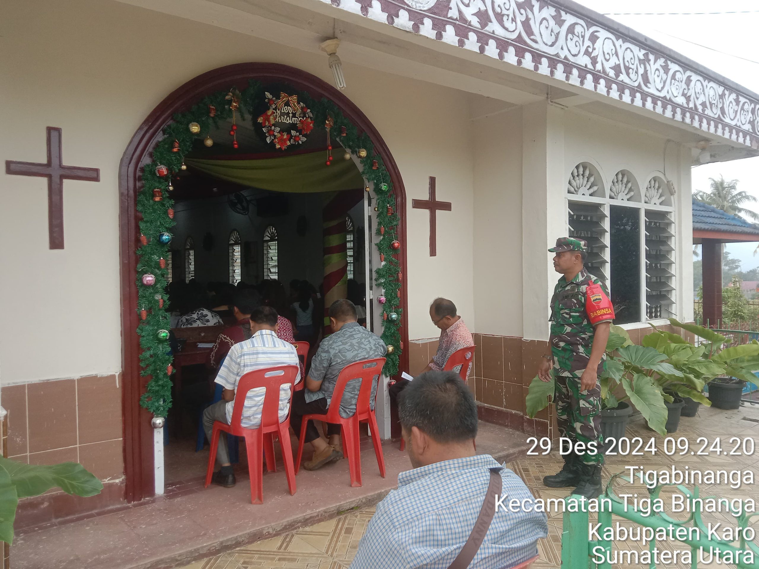 Tanah Karo. Minggu 29/12/2024. Serma Tumino bertugas sebagai Babinsa di Koramil 08/Tigabinanga jajaran Kodim 0205/Tanah Karo melaksankaan kegiatan Komsos (Komunikasi Sosial) bersilaturahmi dengan Jemaat saat melaksanakan Pengamanan Ibadah Kebaktian Minggu Di GBKP (Gereja Batak Karo Protestan) Tigabianga Jalan Kutcane Kelurahan Tigabinanga Kecamatan Tigabinanga Kabupaten Karo-Sumatera Utara (29/12).