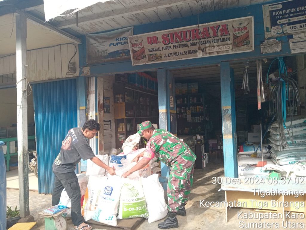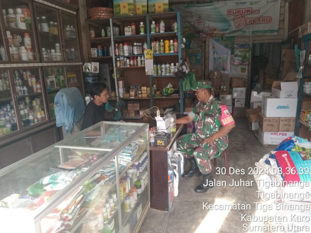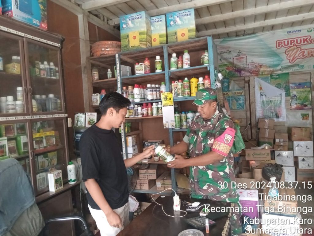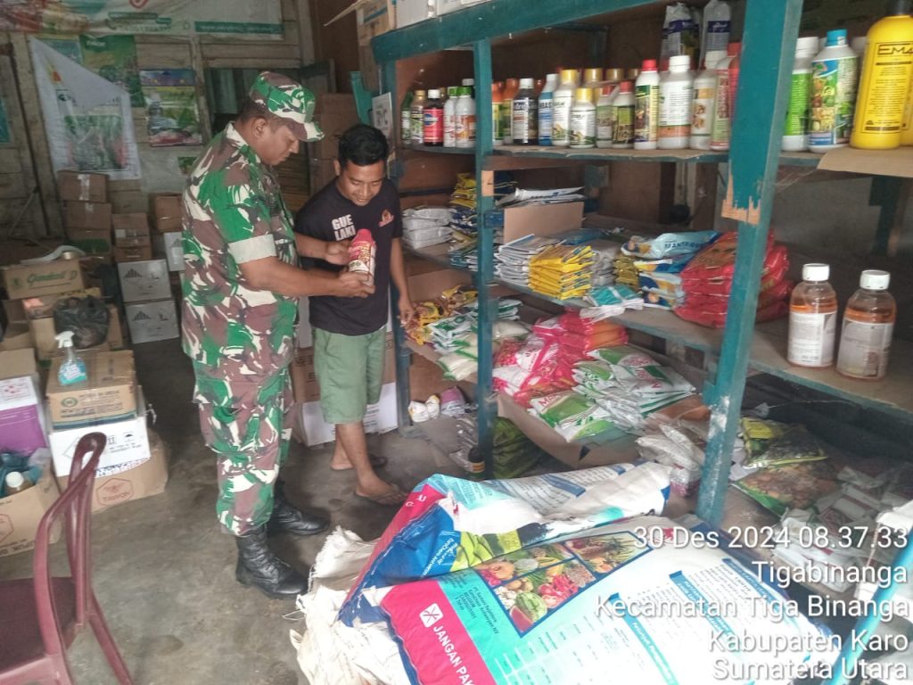 Tanah Karo. Senin 30/12/2024. Kopda Erdiyansyah Tarigan sebagai Babinsa di Koramil 08/Tigabinanga jajaran Kodim 0205/Tanah Karo dalam melaksanakan kegiatan komunikasi sosial, sambil melaksanakan kegiatan pendampingan Upsus program ketahanan pangan yaitu melakukan monitoring harga dan ketersediaan stok pupuk bersubsidi di Gudang maupun Toko Pertanian UD. SINURAYA milik Bapak Karo-karo Sinuraya yang berada di Jl. Kapten pala Bangun No. 56 Kelurahan Tigabinanga Kecamatan Tigabinanga Kabupaten Karo-Sumatera Utara.