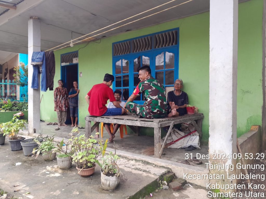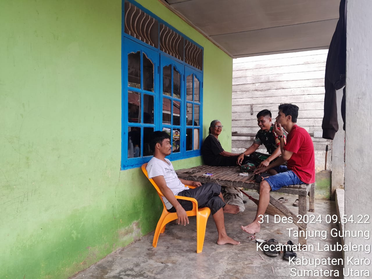 Tanah Karo. Selasa 31/12/2024. Kopda Wais Qarni sebagai Babinsa di Koramil 09/Laubaleng  jajaran Kodim 0205/Tanah Karo melaksanakan kegiatan Pawilbin (Patroli Wilayah Binaan) serta Komsos (Komunikasi Sosial) bersilaturahmi secara humanis dengan masyarakat warga wilayah binaan, sambil menyampaikan imbauan kepada masyarakat baik tua ataupun generasi muda.