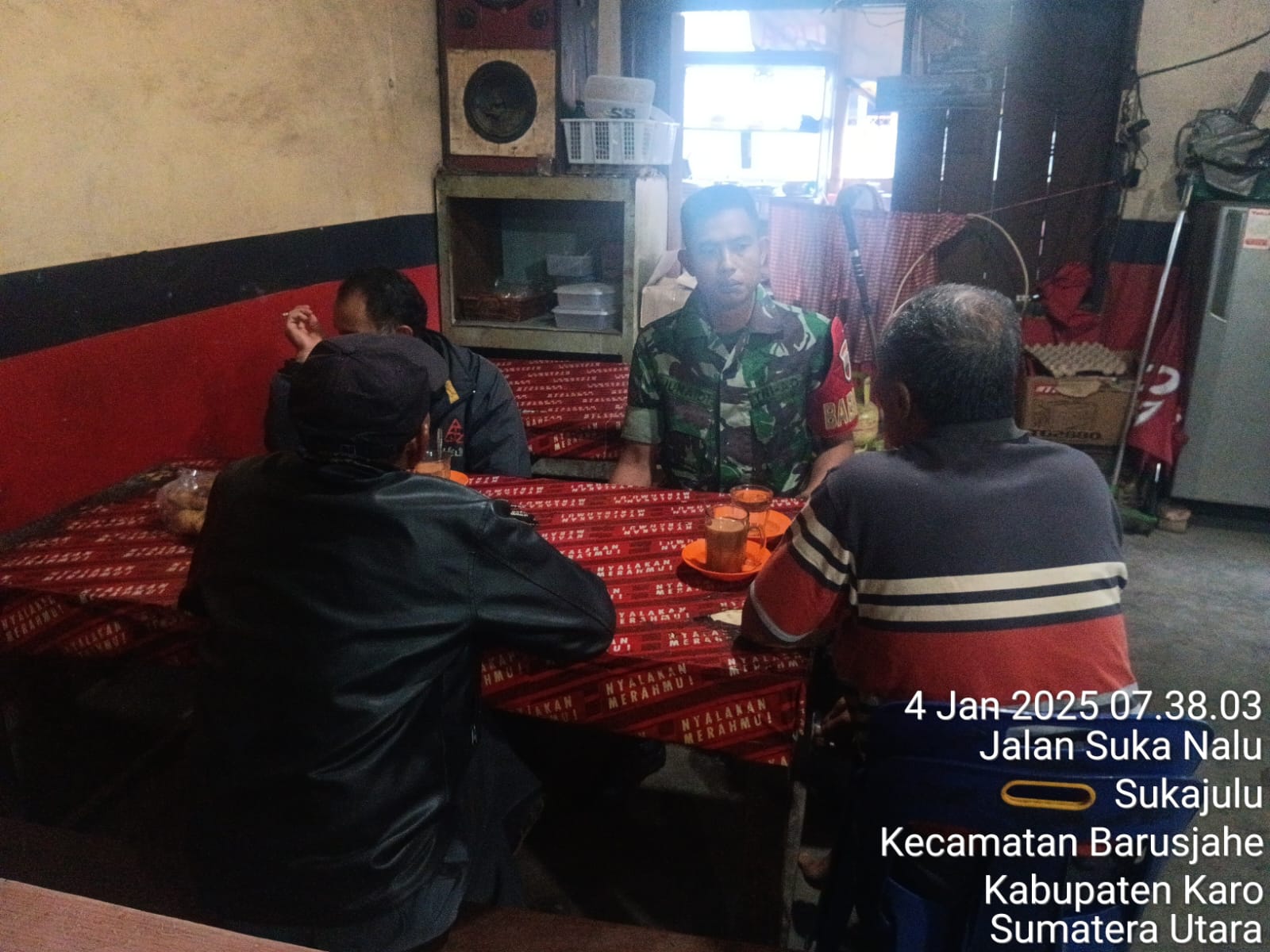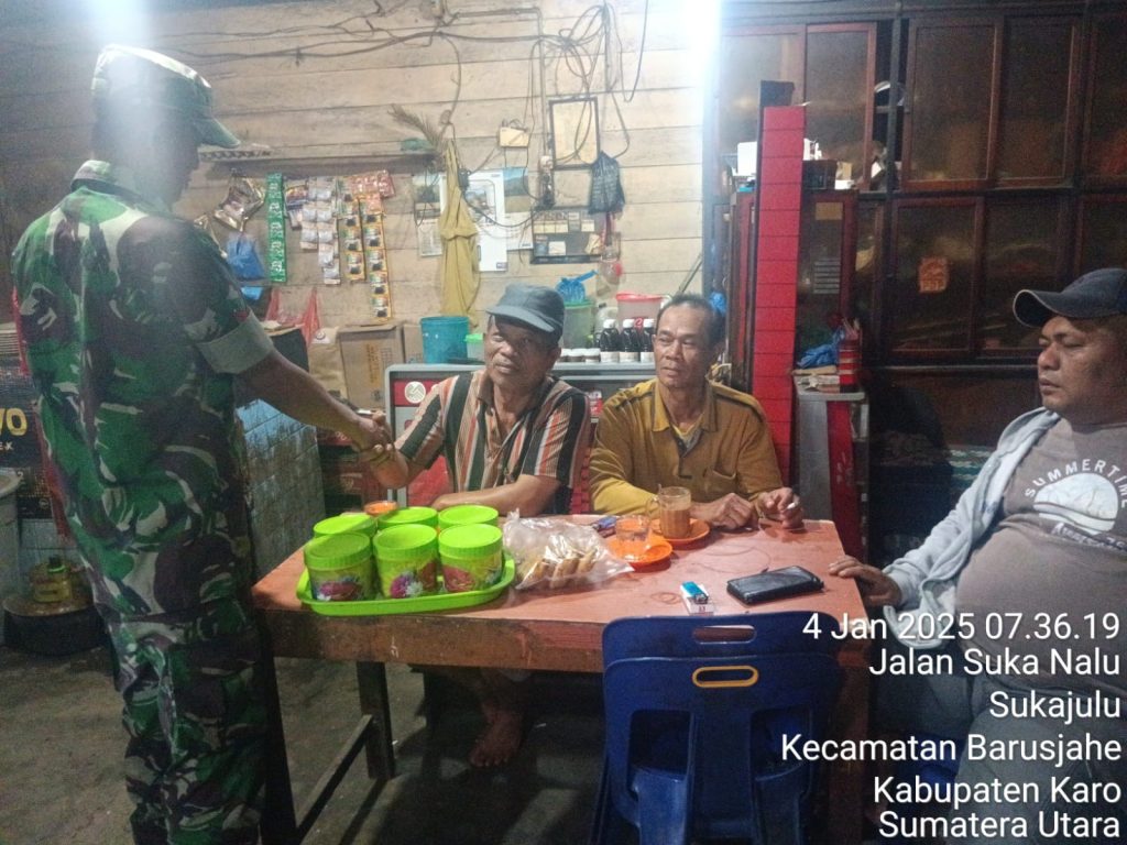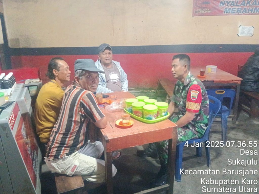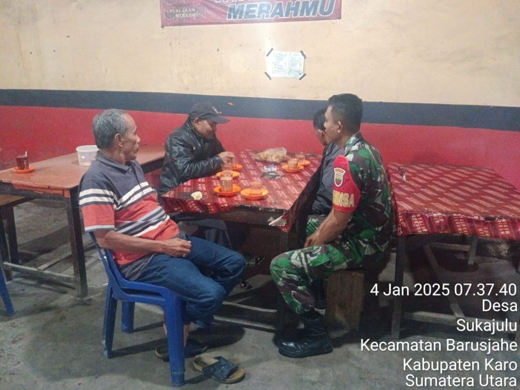 Tanah Karo. Sabtu 04/01/2025. Dalam rangka kegiatan Komsos (Komunikasi Sosial) Koptu Junaidi sebagai Babinsa di Koramil 01/Barusjahe jajaran Kodim 0205/Tanah Karo mempererat silaturahmi unttuk menjaga kedekatan dan kebersamaan dengan masyarakat warga wilayah binaan kegiatan inipun untuk Kemanunggalan antara TNI dengan Rakyat, kegiatan bertempat di Kedai Kopi Bapak Karo-karo Sitepu yang berada di jalan Gotong Royong Desa Sukajulu Kecamatan Barusjahe Kabupaten Karo-Sumatera Utara (04/01).