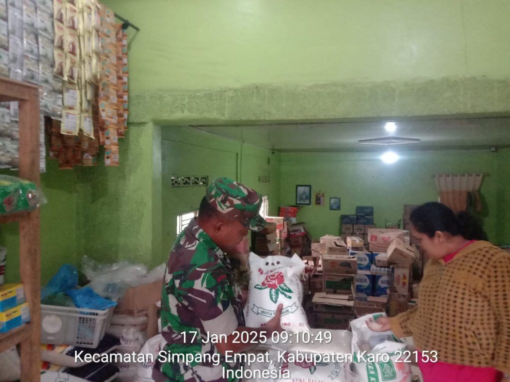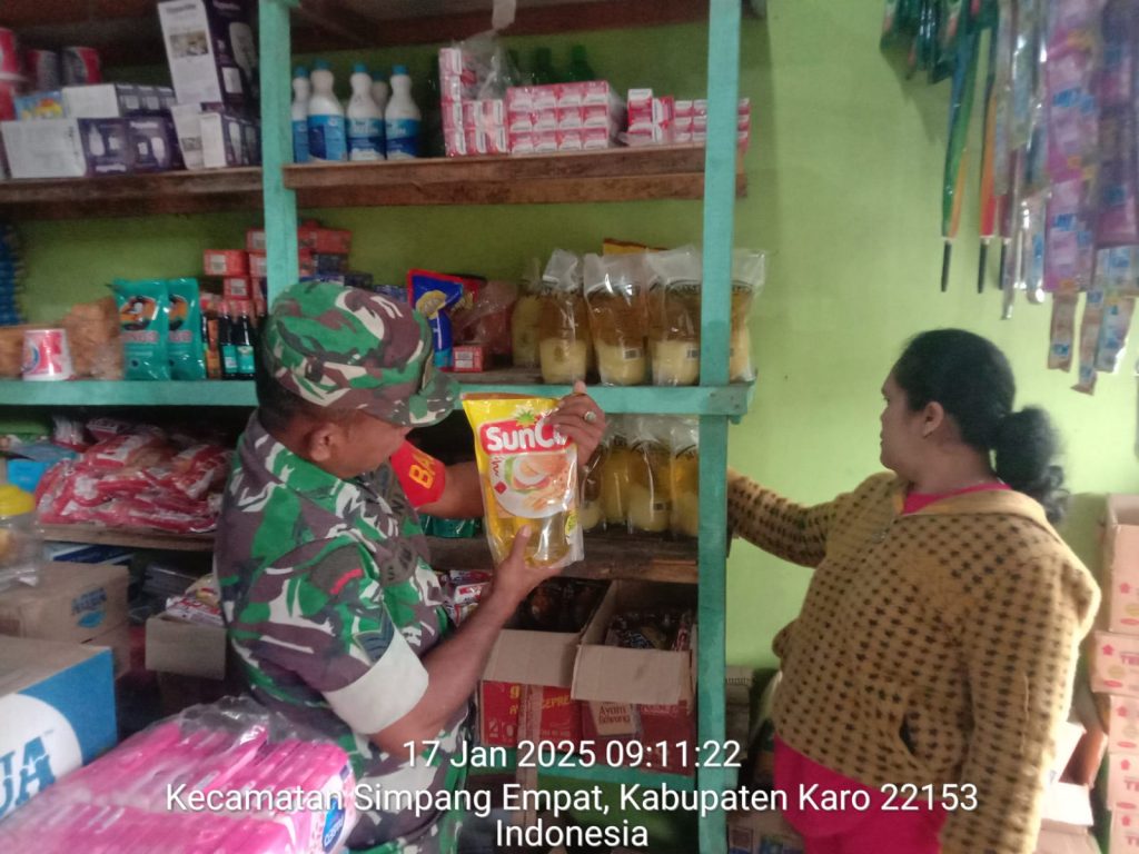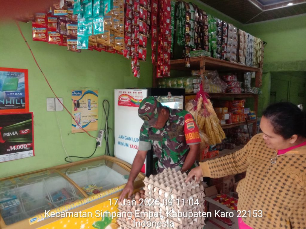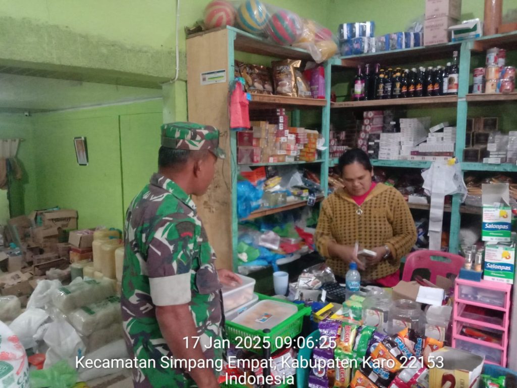 Tanah Karo. Jumat 17/01/2025. Para Personel Koramil 04/Simpang Empat jajaran Kodim 0205/Tanah Karo di perintahkan Danramil Kapten Czi Menson Tarigan supaya saat Komsos di Grosir/Toko Bahan Pangan sambil monitoring mengecek harga dan ketersediaan beras, telur dan minyak makan yang menjadi kebutuhan pokok masyarakat termasuk mengecek peredaran beras busuk dan berkutu maupun mananan kadaluarsa, kegiatanpun dilaksanakan dengan cara Komunikasi Sosial atau lebih dikenal Komsos bersilaturahmi menyapa warga.