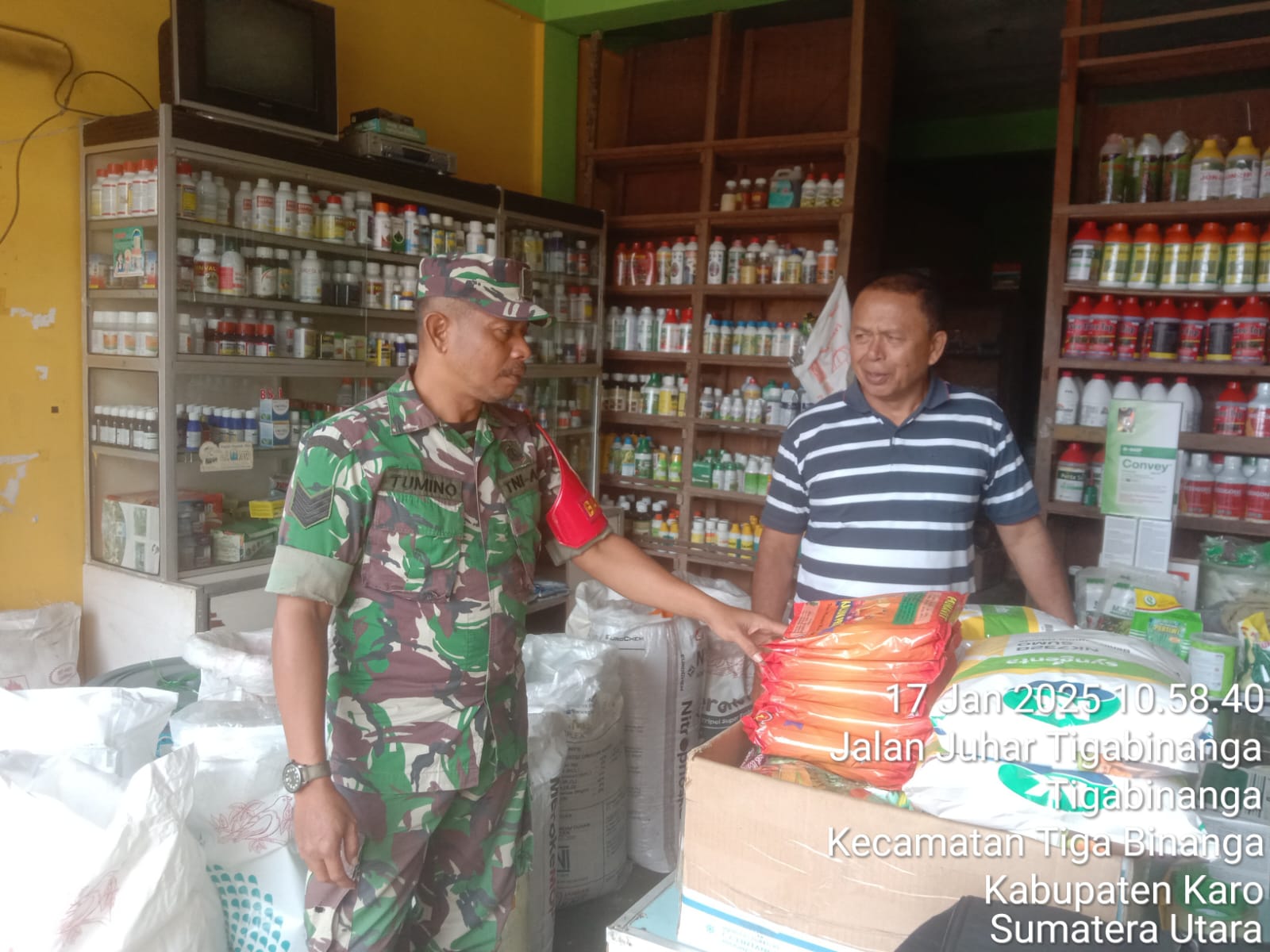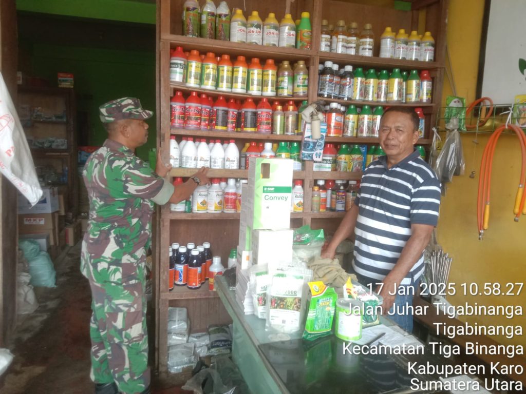 Serma Tumino juga bertugas sebagai Babinsa (BIntara Pembina Desa) di Koramil 08/Tigabinanga juga mendapat perintah dari Danramil agar dalam melaksanakan kegiatan Pawilbin dan Komsos bersilaturahmi dilanjutkan melakukan monitoring pengecekan Stok Pupuk Bersubsidi, Non Subsidi dan Obat-obatan pertanian di wilayah Binaan tepatnya di Toko Pertanian UD. BAHTERA TANI di Pasar Tigabinanga Jalan Juhar Kelurahan Tigabinanga Kecamatan Tigabinanga Kabupaten Karo-Sumatera Utara (17/01).