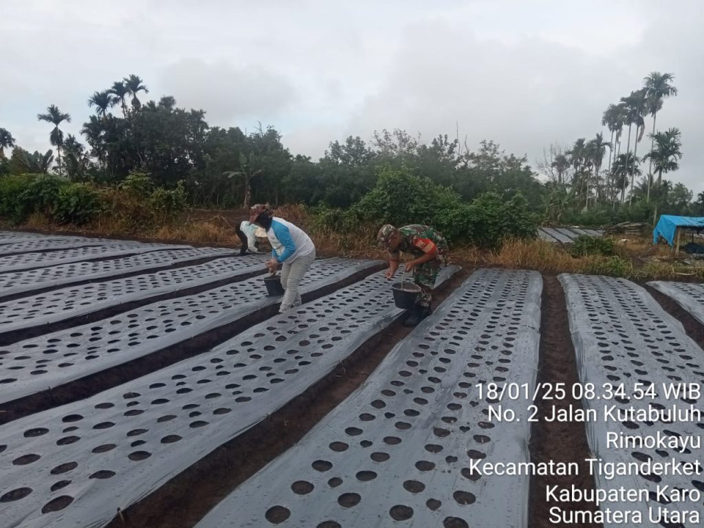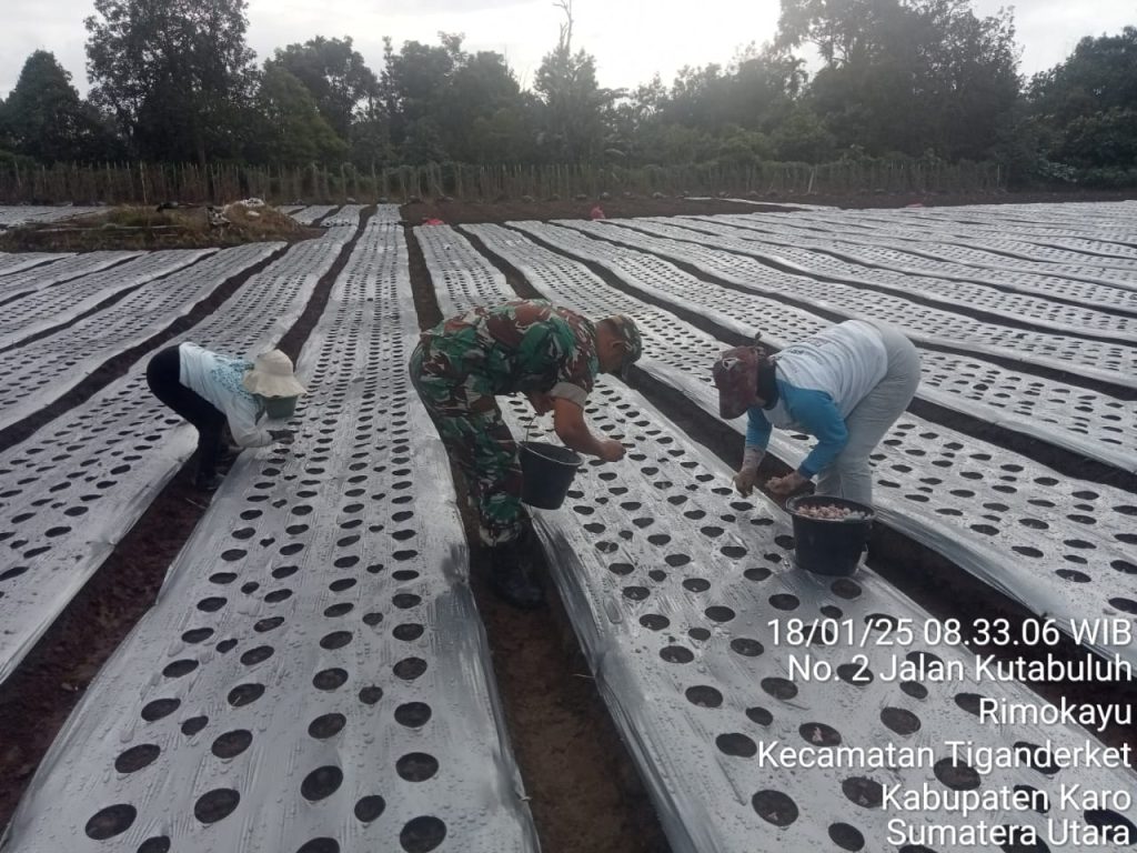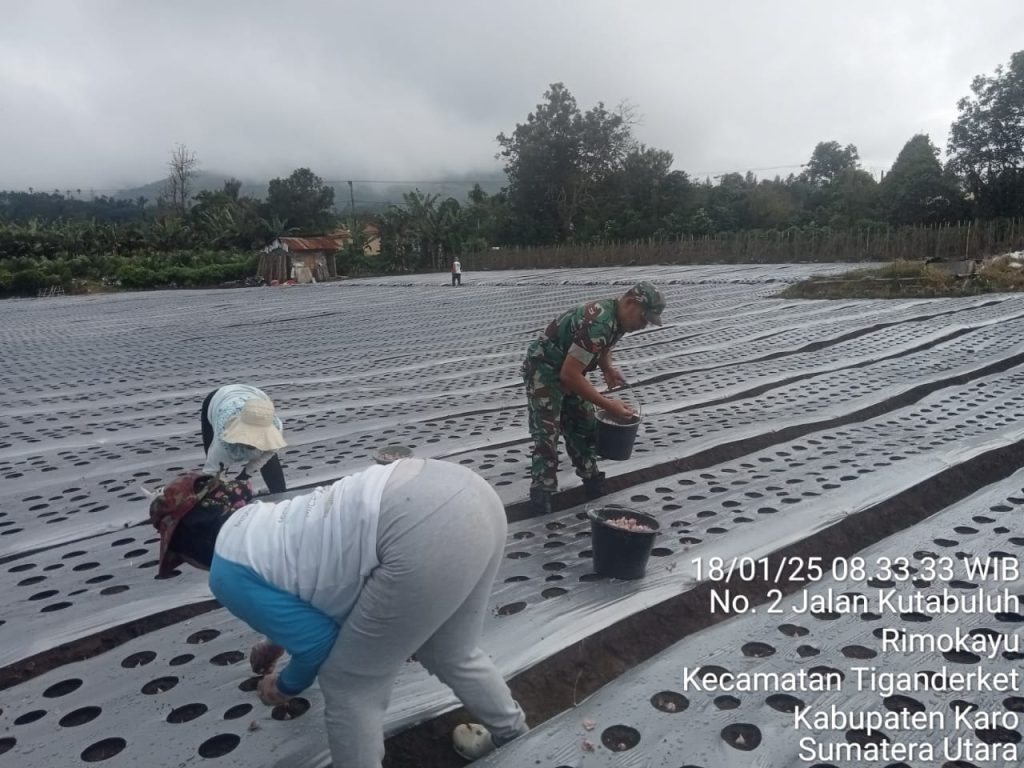 Tanah Karo. Sabtu 18/01/2025. Babinsa Koramil 05/Payung jajaran Kodim 0205/Tanah Karo Koptu Irwan F Sitepu melaksanakan kegiatan Humanis dsn Pendampingan Pertanian yaitu membantu dan mendampinagi Petani Ibu Sri Handayani Beru Tarigan bersama PHL (Pekerja Harian Lepas) atau Aron menanam bibit bawang merah di lahan seluas 0,4 hektar di Desa Rimo Kayu Kecamatan Payung Kabupaten Karo Sumatera Utara (18/01).