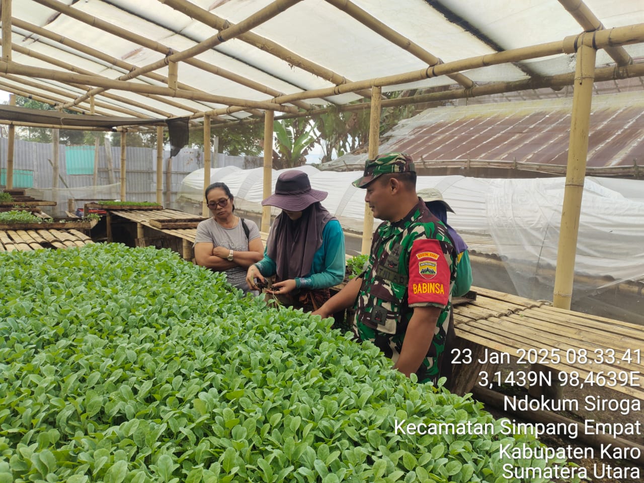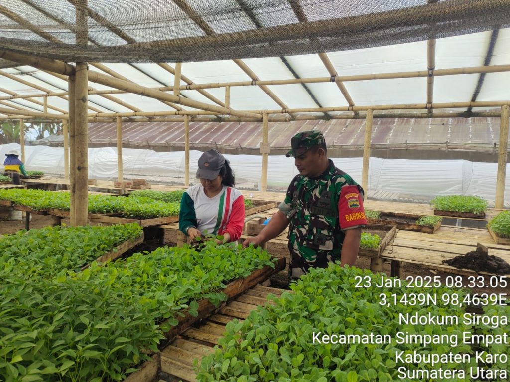 Tanah Karo. Kamis 23/01/2025.  Babinsa Koramil 04/Simpang Empat jajaran Kodim 0205/Tanah Karo Serda Agus Supriadi bertempat di Green House Pembibitan tanaman muda atau sayur mayur UD. K. Sirbakti di Desa Ndokum Siroga Kecamatan Simpang Empat Kabupaten Karo-Sumatera Utara,melaksanakan kegiatan Komsos (Komunikasi sosial) yang dilaksanakan oleh adalah bersilaturahmi dan menyapa warga,  juga dalam kegiatan ini sambil Pendampingan Pertanian  yaitu mendampingi maupun membantu merawat bibit tanaman muda jenis  sayur cabe, tomat, sawi pahit, sawi manis, sawi pagoda, selada bokor dan kol/kubis (23/01).