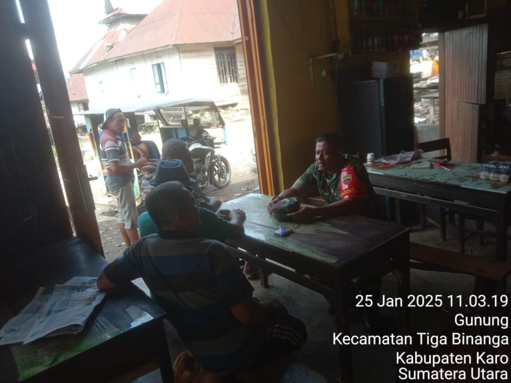 Kegiatan tersebut juga dilaksanakan Serma Tumino sebagai Babinsa Koramil 08/Tigabinanga jajaran Kodim 0205/Tanah Karo yaitu bersilaturahmi dengan warga berlokasi di Kedai Kopi Gabriel Singarimbun Jalan Kutabuluh Desa Gunung Kecamatan Tigabinanga Kabupaten Karo-Sumatera Utara, mereka sambil mengumpulkan informasi perkembangan situasi Geo Demo Konsos terutama Ipoleksobud Hankam.