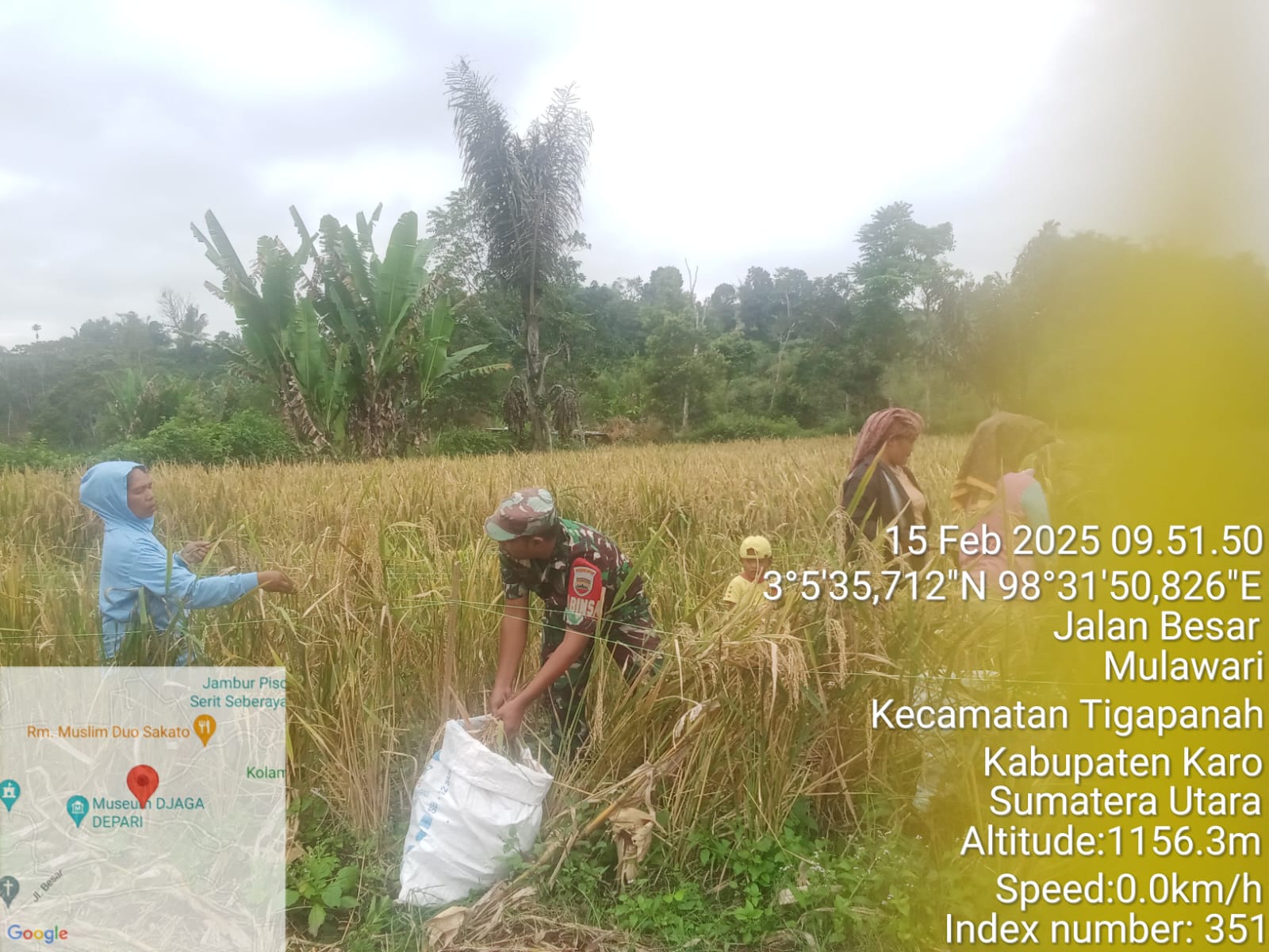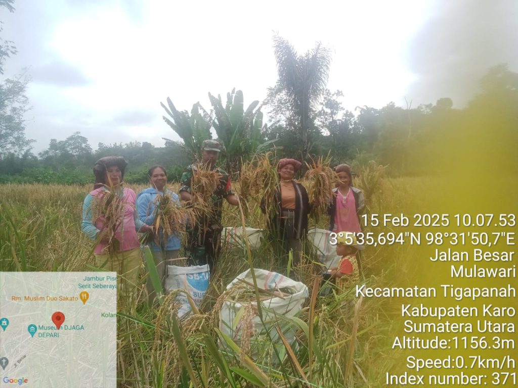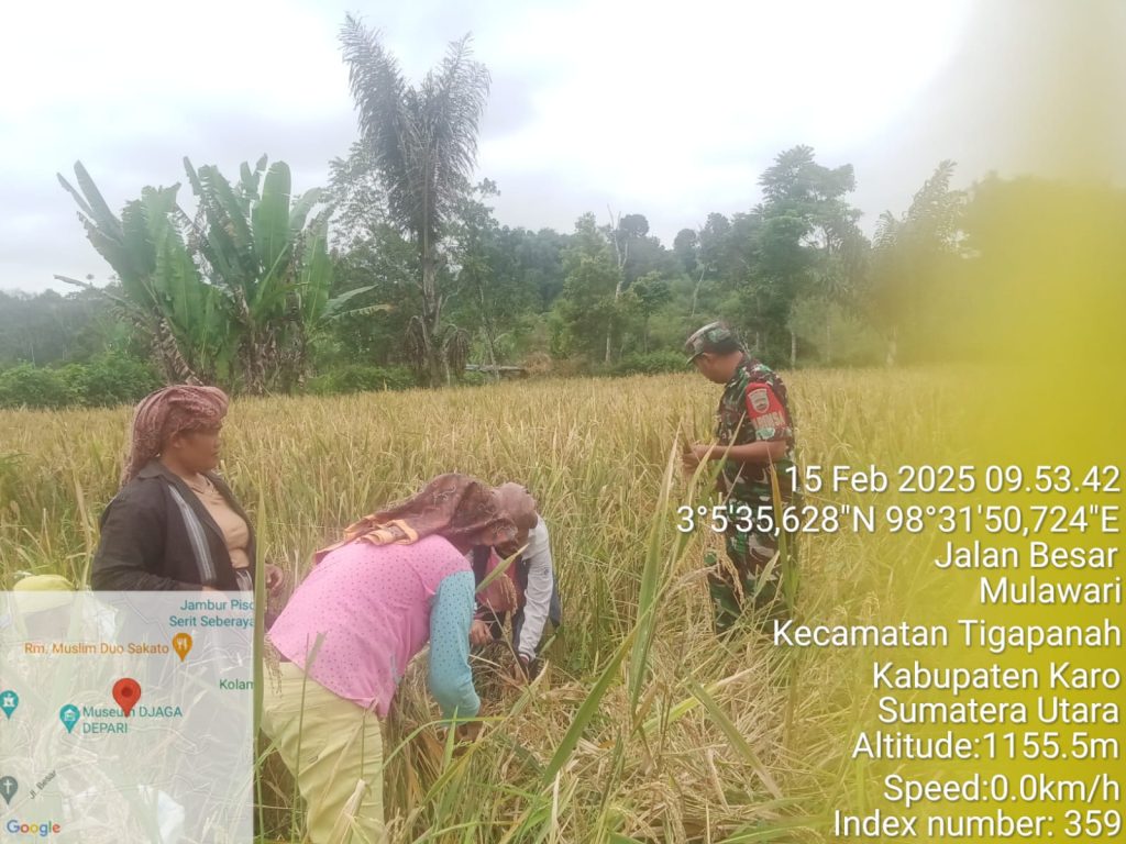 Tanah Karo. Sabtu 15/02/2025. Berlokasi di lahan pertanian Desa Seberaya Kecamatan Tigapanah Kabupaten kaso Sumatera Utara Babinsa Koramil 02/Tigapanah jajaran Kodim 0205/Tanah Karo Sertu Darmanta Perangin-angin melaksanakan Pendampingan Pertanian yaitu mendampingi dan membantu petani padi Ibu Riahna Beru Tarigan panen padi gogo di ladang seluas 3 rante.