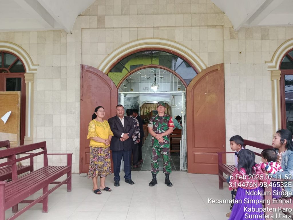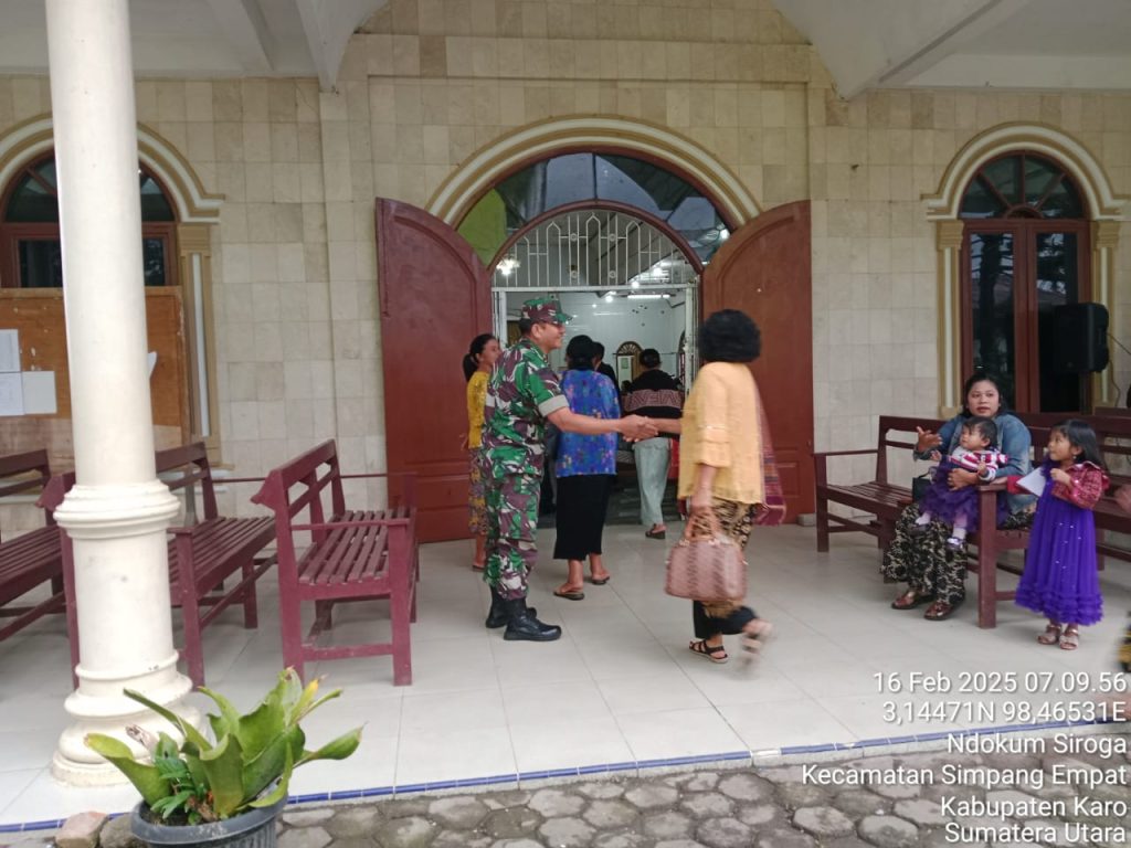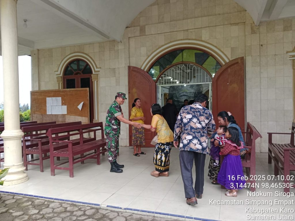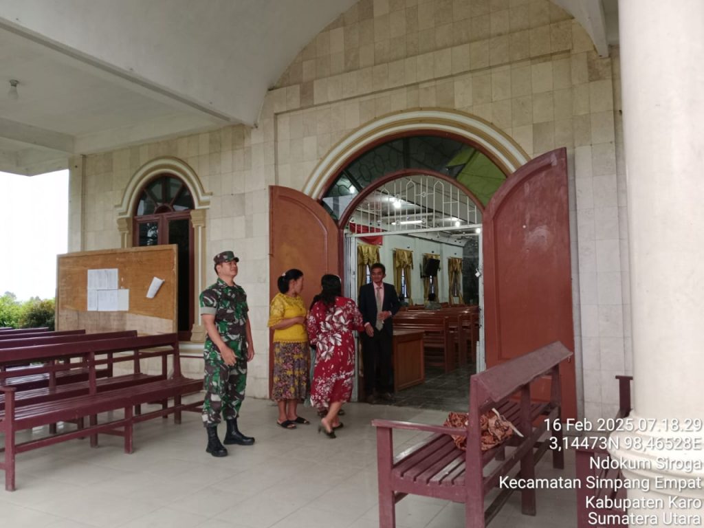 Tanah Karo. Minggu 16/02/2026. Di Koramil 04/Simpang Empat jajaran Kodim 0205/Tanah Karo para Bintara Pembina Desa (Babisan) dalam rangka Komunikasi sosial (Komsos) setiap hari minggu melaksanakan bersilaturahmi dan membantu majelis gereja dalam pengamanan Ibadah Kebaktian Minggu di wilayah binaannya masing-masing juga sambil melaksanakan imbuan kepada warga tentang menjaga keamanan dan ketertiban lingkungan, menjaga kebersihan dan kelestarian lingkungan serta tetap menjaga kerukunan hidup antar warga.
