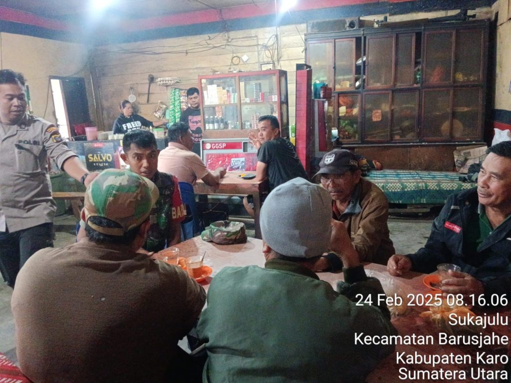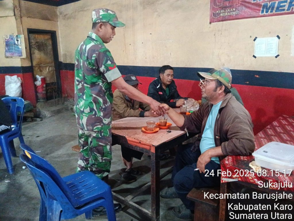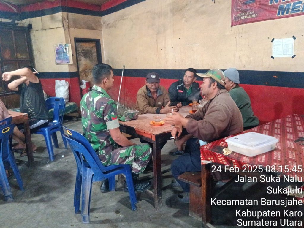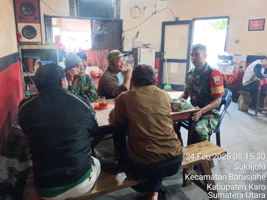 Tanah Karo. Senin 24/02/2025. Babinsa Koramil 01/Barusjahe jajaran Koldim 0205/Tanah Karo Kopda Junaidi Blora menjaga jalina tali silturhami dengan masyarakat warga wilayah binaan dalam rangka Komsos (Komunikasi sosial), kegiatan berlokasi di Kedai Kopi Ma Karo Tigajumpa Jalan Gotong Royong Desa Sukajulu Kecamatan Barusjahe Kabupaten Karo-Sumatera Utara, kegiatan ini sesuai perintah dari Kapten Inf Jonsos E. Simbiring selaku Danramil (24/02).