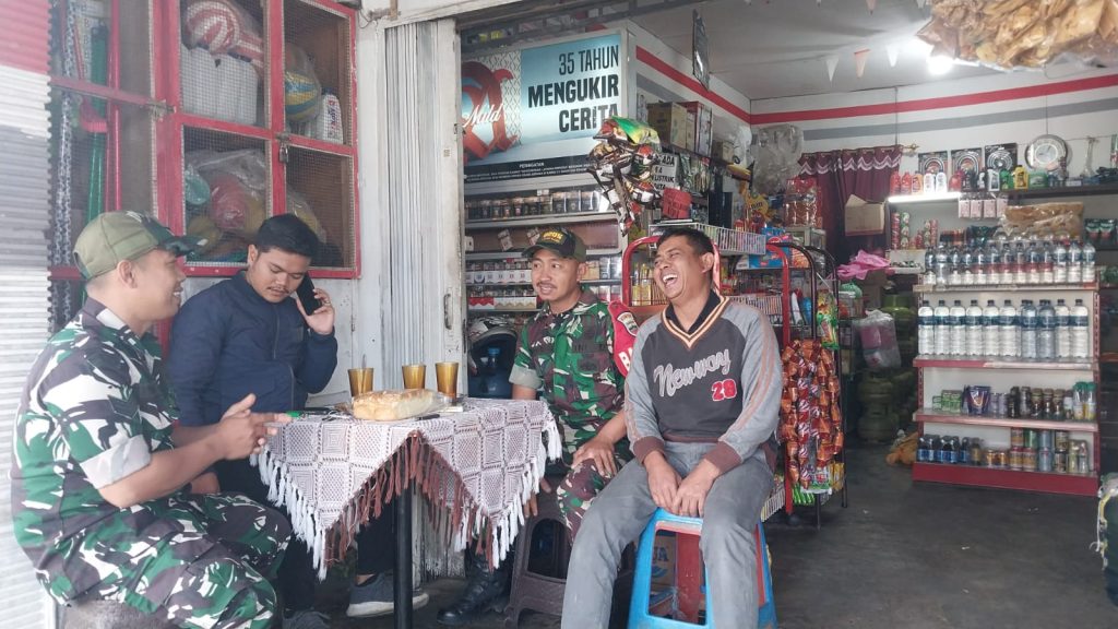 Tanah Karo. Selasa 25/02/2025. Bertempat di Kedai Kopi Bapak Jamal Jalan Kolam Lingkungan X Kelurahah Gundaling-I  Kecamatan Berastagi Kabupaten Karo-Sumatera Utara, Serka Muryono Imam dan Serda Waluyo Widodo yang bertugas sebagai para Babinsa (Bintara Pembina Desa) di Koramil 03/Berastagi jajaran Kodim 0205/Tanah Karo melaksanakan bersilaturahmi  dengan masyarakat warga wilayah binan dalam rangka Komunikasi Sosial (Komsos).