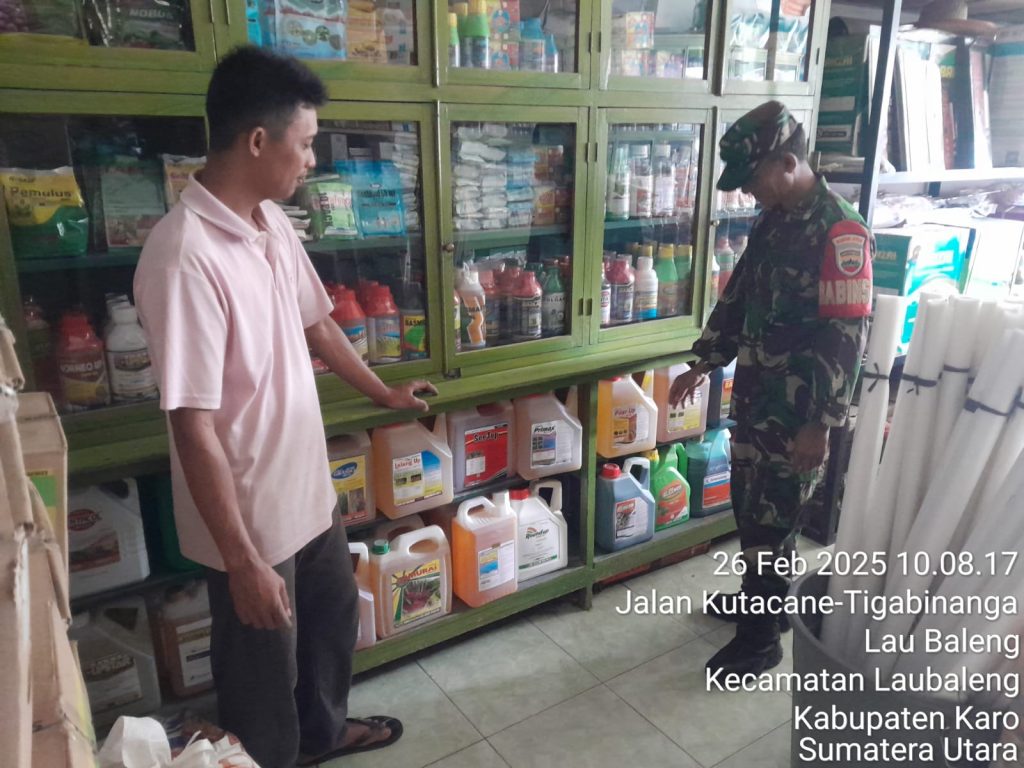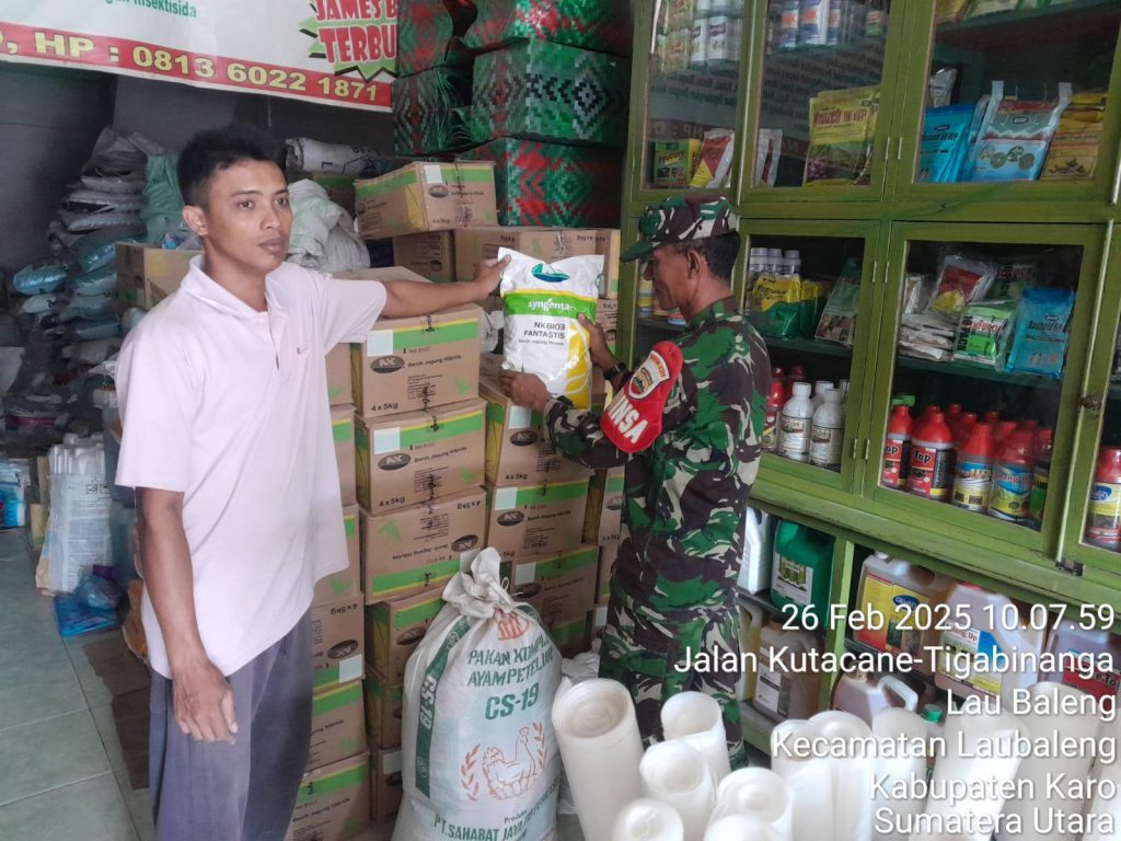 Tanah Karo. Rabu 26/02/2025. Guna menyukseskan Binter TNI dan Ketahanan Pangan Nasional, Kapten Inf Gandhi N. Hartanto selaku Danramil 09/Laubaleng jajaran Kodim 0205/Tanah Karo perintahkan para Babinsanya melaksanakana kegiatan Komunukasi Sosial sambil monitoring mengecek harga dan ketersediaan stok pupuk maupun obat-obatan pertanian dalam rangka memastikan kebutuhan yang diperlukan oleh masyarakat warga wilayah binaana yang bermata pencaharian sebagai petani terpenuhi, sehingga proses bercocok tanam tidak terkendala.
