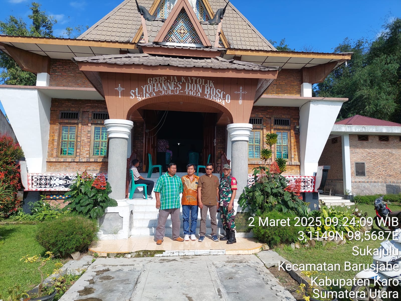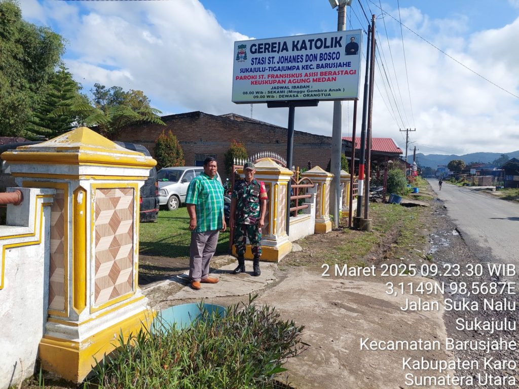 Tanah Karo. Minggu 02/03/2025. Serka Reka Juli Rahmat yang bertugas sebagai Babinsa di Koramil 01/Barusjahe melaksanakaan Pengamanan Ibadah Kebaktian Minggu sambil komunikasi sosial bersilaturahmi secara humanis dan imbauan bertempat di Gereja Katholik Stasi St. Johanes Don Bosco Sukajulu Tigajumpa di Jalan Tigapanah-Tongkoh Desa Sukajulu Kecamatan Barusjahe Kabupaten Karo Sumatera Utarapada hari minggu inipun (02/03), Babinsa melaksanakan kegiatan bersama Petugas dan Pembaca Bapak Karton Sitepu dan Ibu Dani Beru Tarigan.