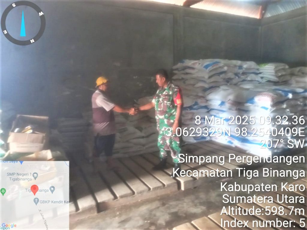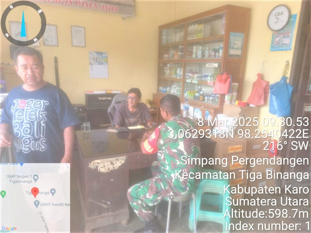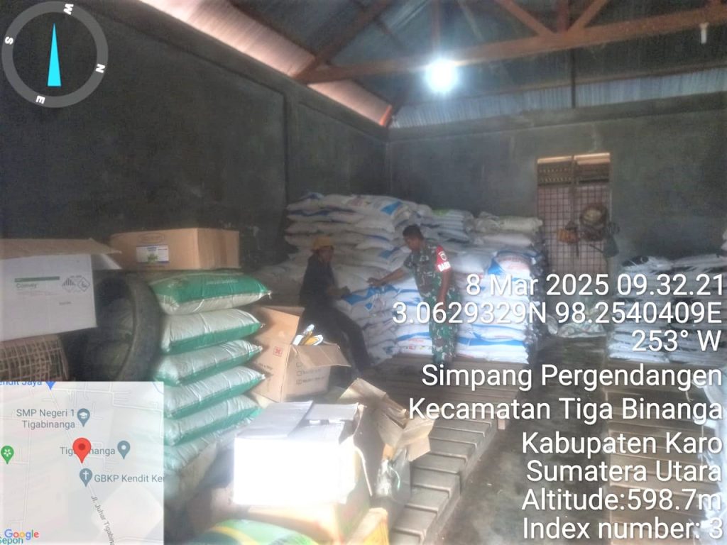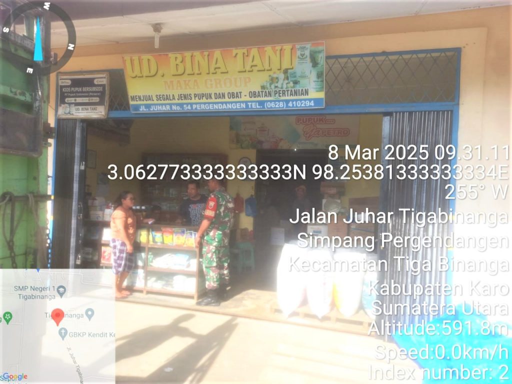 Tanah Karo. Sabtu 09/03/2025. Kopda Ediyansah Tarigan bertugas sebagai Babinsa di Koramil 08/Tigapanah jajaran Kodim 0205/Tanah Karo mendapat perintah dari Kapten Inf J.M.H. Tampubolon Daramil agar dalam melaksanakan kegiatan Pawilbin dan Komsos bersilaturahmi dilanjutkan melakukan monitoring pengecekan harga maupun stok ketersediaan Pupuk Bersubsidi, Non Subsidi dan Obat-obatan pertanian.