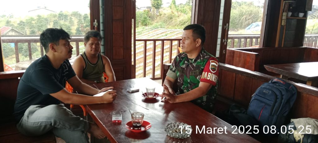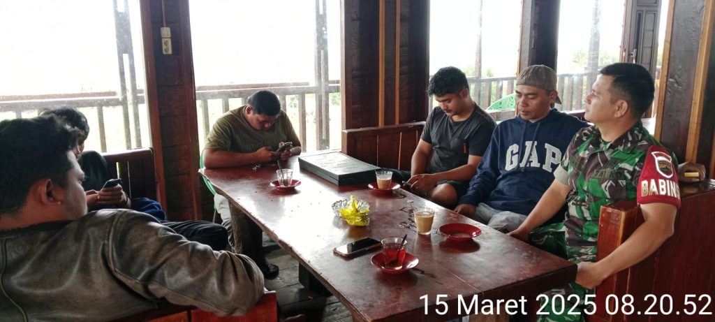 Tanah Karo. Sabtu 15/03/2025. Sertu Jepe Butarbutar Babinsa di Koramil 04/Simpang Empat jajaran Kodim 0205/Tanah Karo melaksanakan kegiatan Komsos (Komunikasi Sosial) bersilaturahmi dengan masyarakat warga wilayah binaan dalam rangka menyukseskan kegiatan Pembinaan Teritorial TNI, kali ini berlokasi di Di kedai Kopi Bapak Dandi Ginting Jalan Laukawar Desa Kuta Rayat Kecamatan Naman Teran Kabupaten Karo Sumatera Utara (15/03).