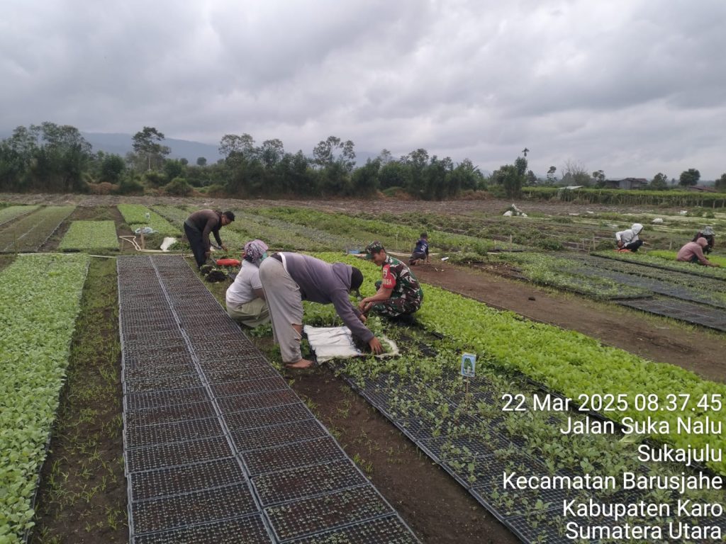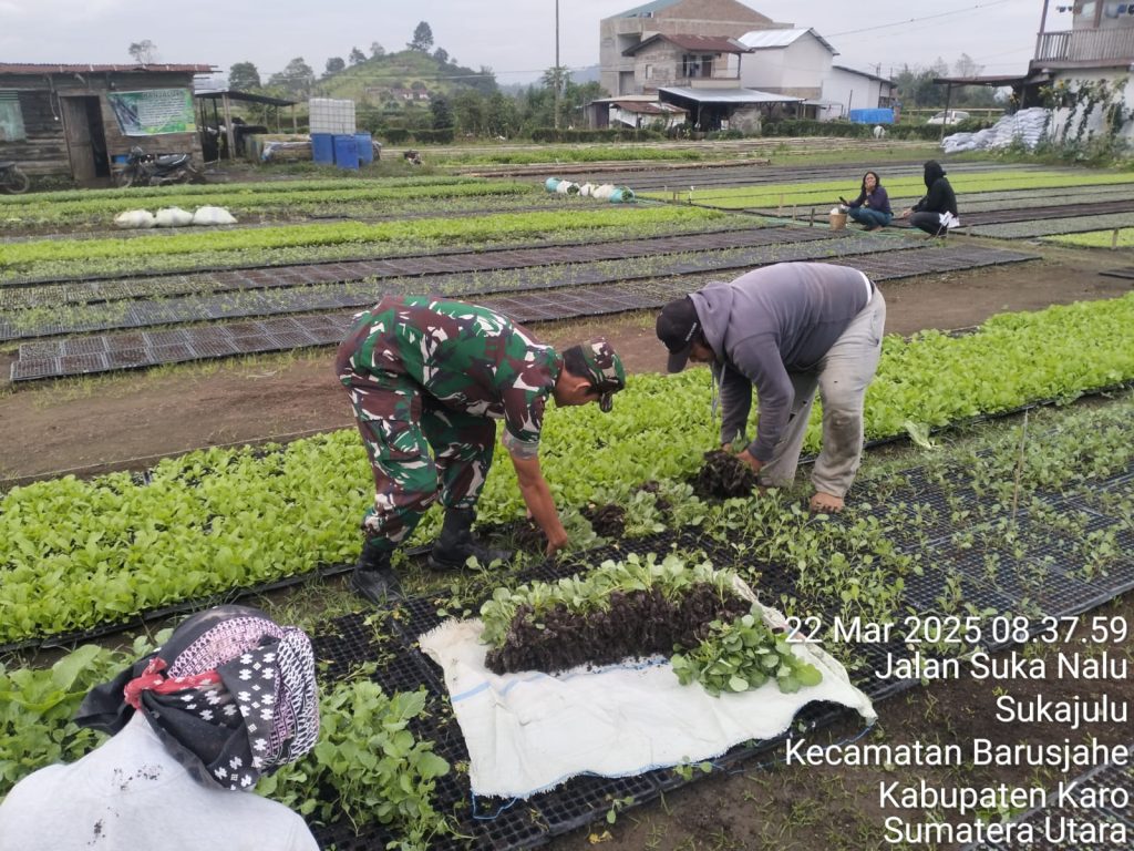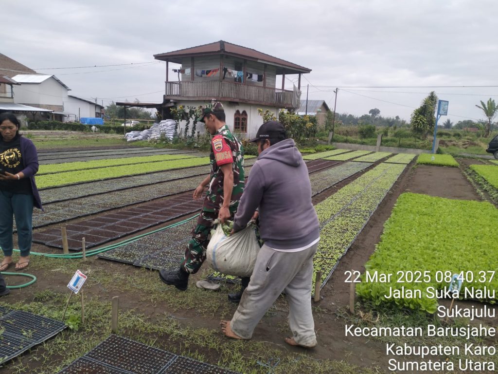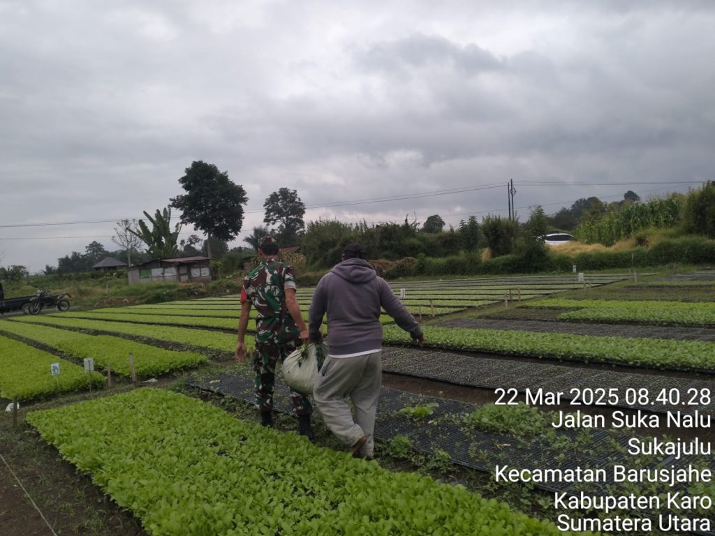 Tanah Karo. Sabtu 22/03/2025. Berkunjung ke desa binaan rutin dilakukan oleh Serka Tudiono Situmorang sebagai Babinsa di Koramil 01/Barusjahe jajaran Kodim 0205/Tanah Karo melaksanakan bersilaturahmi dengan warga dalam rangka Komunikasi Sosial (Komsos) sambil pendampingan Pertanian yaitgu membantu perawatan tanaman sayur bibit tanaman cabai, tomat, terong, kol, sawi dan selada serta beberapa jenis bibit sayuran lainnya, kegiatan berlokasi di Pembibitan Tanaman UD SPJ milik Ibu Rati Beru Ginting di Jalan Tigapanah -Tongkoh Desa Sukajulu Kecamatan Barusjahe Kabupaten Karo-Sumatera Utara.